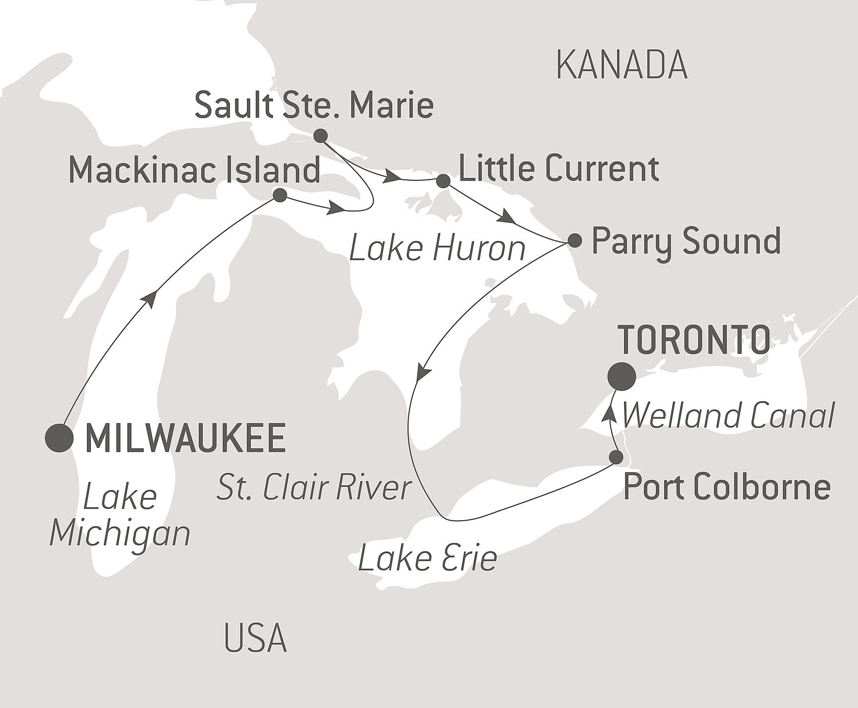 Der Huronsee ist einer der fünf amerikanischen Großen Seen und einer der größten Süßwasserseen der Welt. Er bildet die natürliche Grenze zwischen dem amerikanischen Staat Michigan und der kanadischen Provinz Ontario. Er besteht aus dem Hauptsee, der Saginaw-Bucht, dem Nordkanal und der Georgsbucht und beherbergt etwa 30.000 Inseln. Den Besucher besticht er mit einer Vielzahl von Küstenlandschaften und einzigartigen Ausblicken. Vom Schiff aus können Sie die wilde Schönheit der bewaldeten und zuweilen steilen Küste der Insel Manitoulin oder die spektakulären Klippen der Bruce-Halbinsel bewundern.