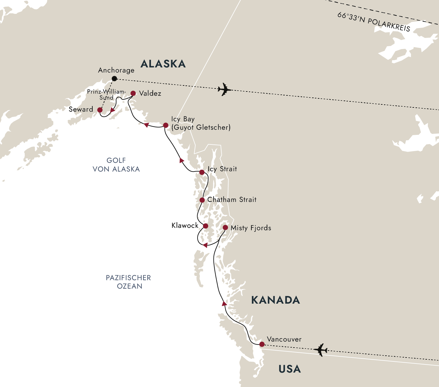 Ihre Seereise endet in Seward. Transfers nach Anchorage müssen selbstständig gebucht werden.
