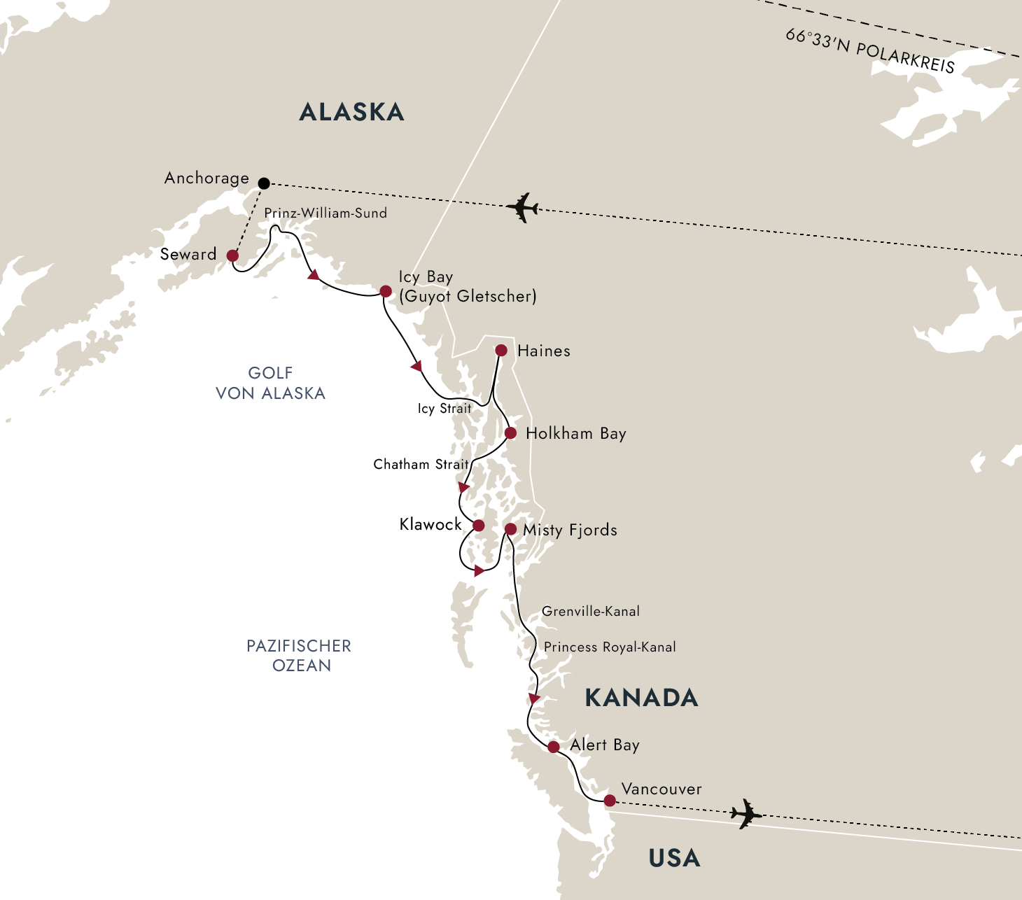 Nach Ihrem Flug aus Deutschland und Ihrer Ankunft am Flughafen in Anchorage genießen Sie eine landschaftlich reizvolle Fahrt nach Seward. Unsere Route führt uns quer über die Kenai-Halbinsel, die bei Einheimischen und Touristen gleichermaßen als eine der beeindruckendsten Landschaften der Welt gilt. Nach einer Fahrt voller spektakulärer Eindrücke kommen wir schließlich an der Pazifikküste an, wo unser Expeditionsschiff bereits auf Sie wartet.