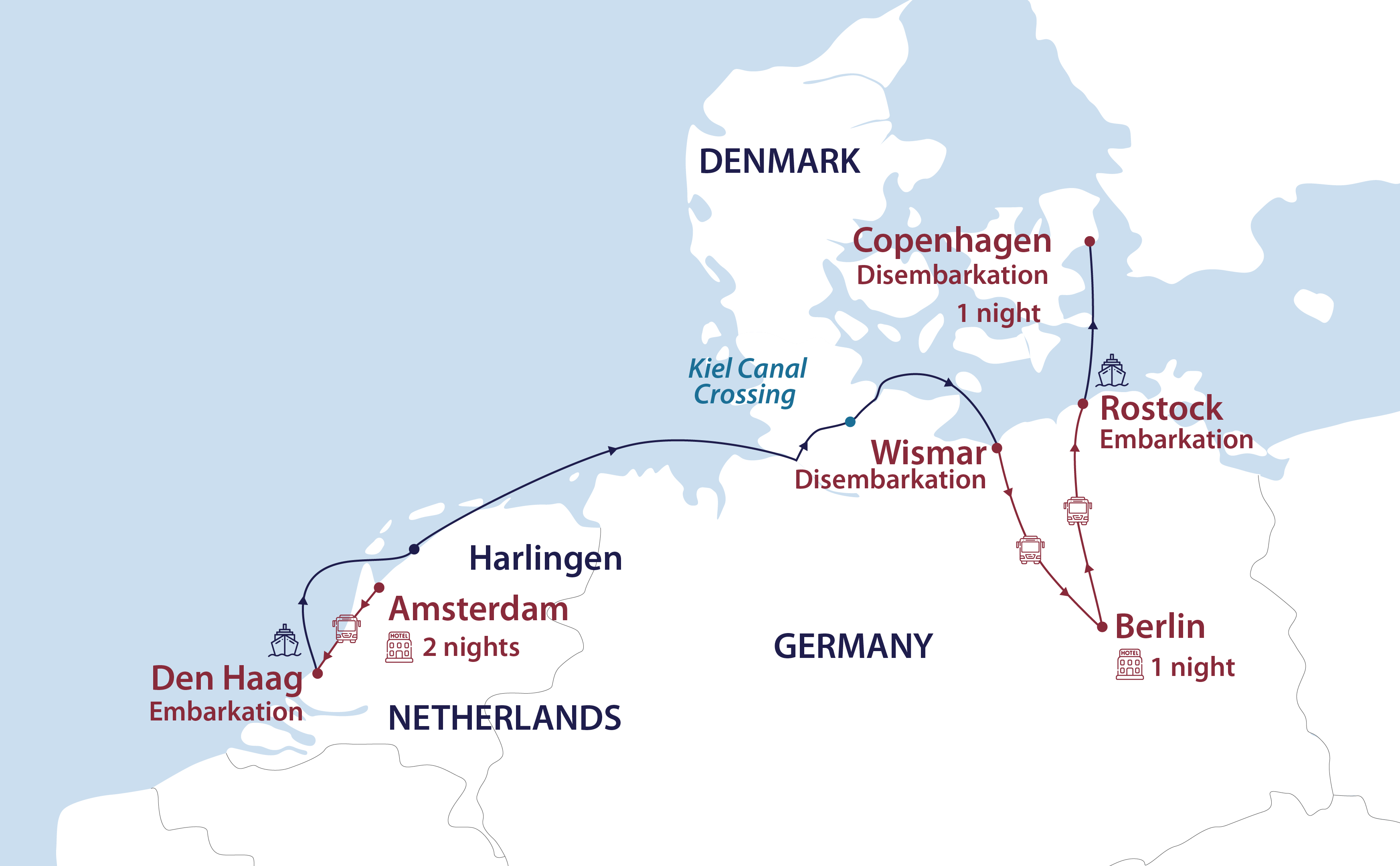 One night’s hotel accommodation, including breakfast, in Copenhagen on Day 9