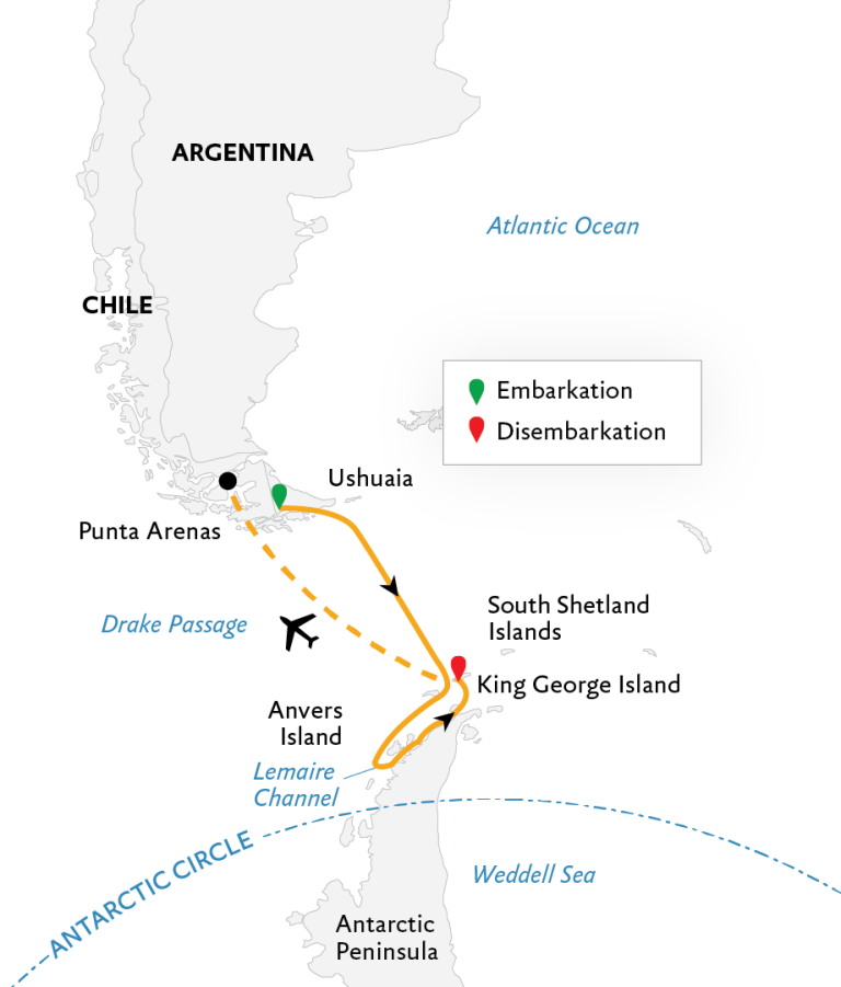 With only the Drake Passage ahead, you’ll disembark on King George Island before flying to Punta Arenas, Chile. Once you’re in Punta Arenas, we’ll transfer you from the airport to your designated group hotel. You're then free to explore Punta Arenas and enjoy a final dinner on your own.