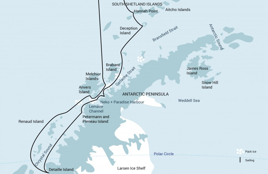 Crystal-Sound – Die Reise führt Sie weiter nach Süden, vorbei an den Argentine-Islands zu einer mit Eis übersäten Wasserfläche. Sie befinden sich in der Nähe des Polarkreises, welchen Sie am Morgen überqueren werden.