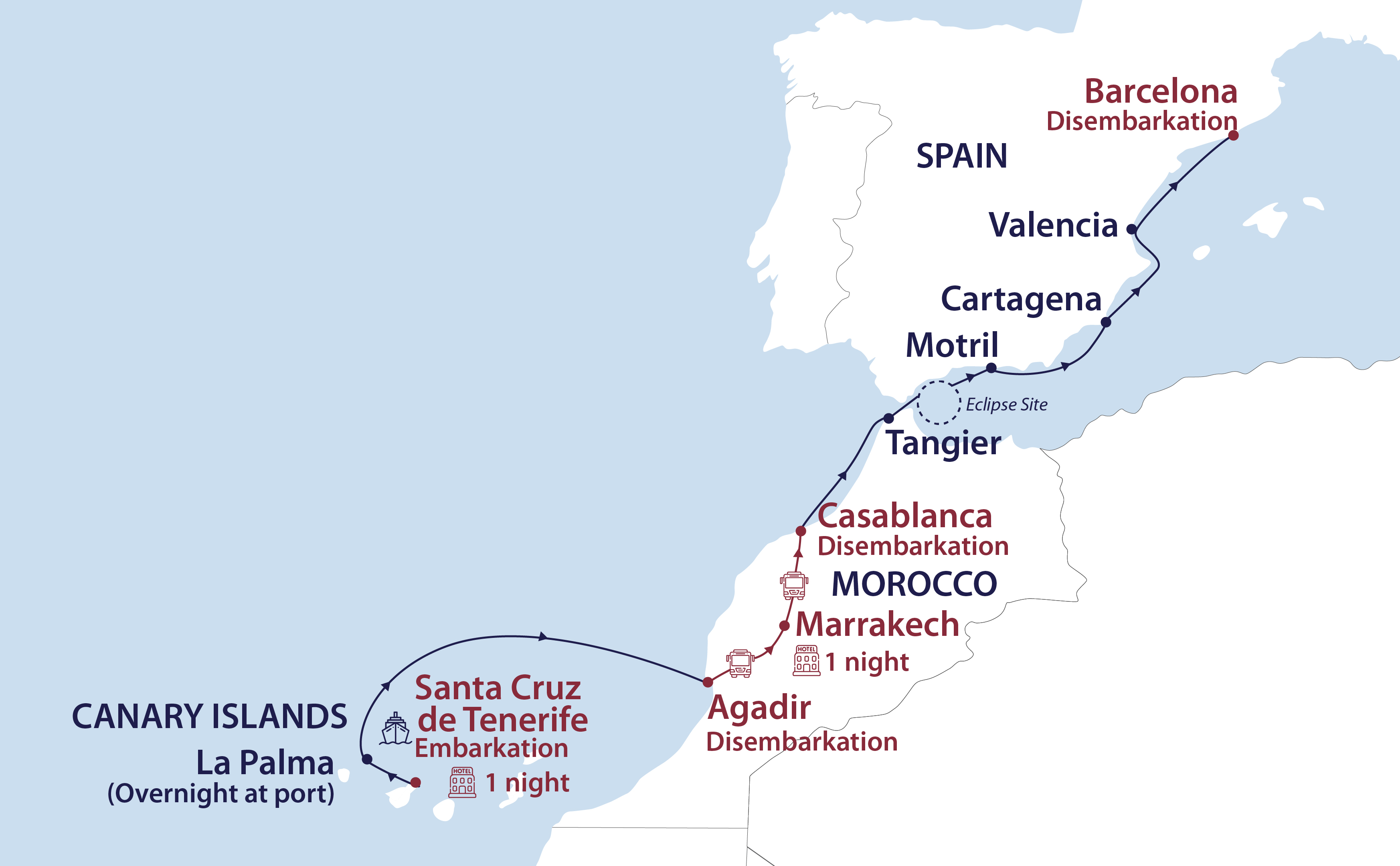 Our day begins early with a thorough briefing on today's events. The ship will be moored off the Moroccan coastal town of M'diq, directly under the line of totality, offering ideal conditions for viewing. One advantage of being at sea is the flexibility to shift position if weather conditions change, ensuring the best possible experience. At our planned location, the eclipse begins at approximately 08:41 (first contact), with totality starting around 09:45 at an elevation of 38.4 degrees. Totality here will last an impressive 4 minutes and 53 seconds. This is no ordinary eclipse. Today, North Africa will witness the longest eclipse totality on land since 1991, and until 2114. The moon’s 160-mile-wide (258 km) shadow will take 3 hours and 20 minutes to cross the globe, sweeping from the Atlantic, across North Africa and the Middle East, to the Indian Ocean. As the sun and the moon go their separate ways, we gather in the early afternoon to de-brief our experience, as we sail towards the Spanish coast, ready for our first landfall tomorrow morning at the port of Motril, gateway to the famed city of Granada. *Note: While every effort will be made to ensure a steady position, please be aware that the ship may experience some movement during the event. A completely stable platform cannot be guaranteed, which may impact long-exposure photography.