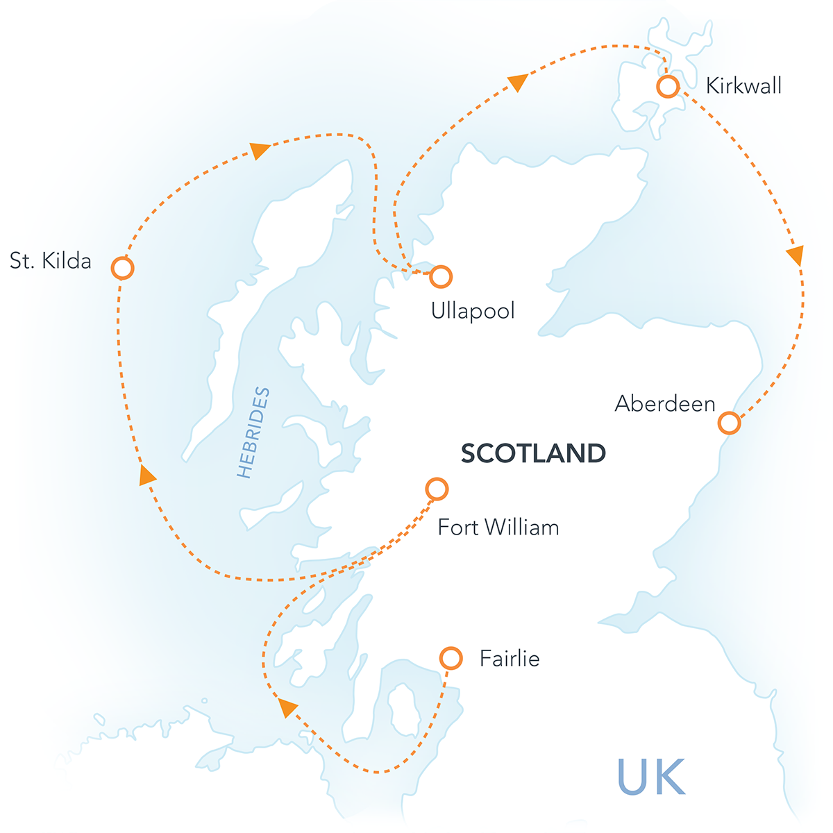 Aberdeen, Ausschiffung Am letzten Tag unserer Expedition erreicht die Ocean Victory das Herz der Granitstadt. Nach einer herzlichen Verabschiedung von den Offizieren und der Crew betreten Sie die Granitstraßen der wichtigsten Hafenstadt Schottlands – der ideale Ort, um mit wertvollen Erinnerungen an die Glens nach Hause zurückzukehren oder die Wunder des östlichen Schottlands weiter zu erkunden.