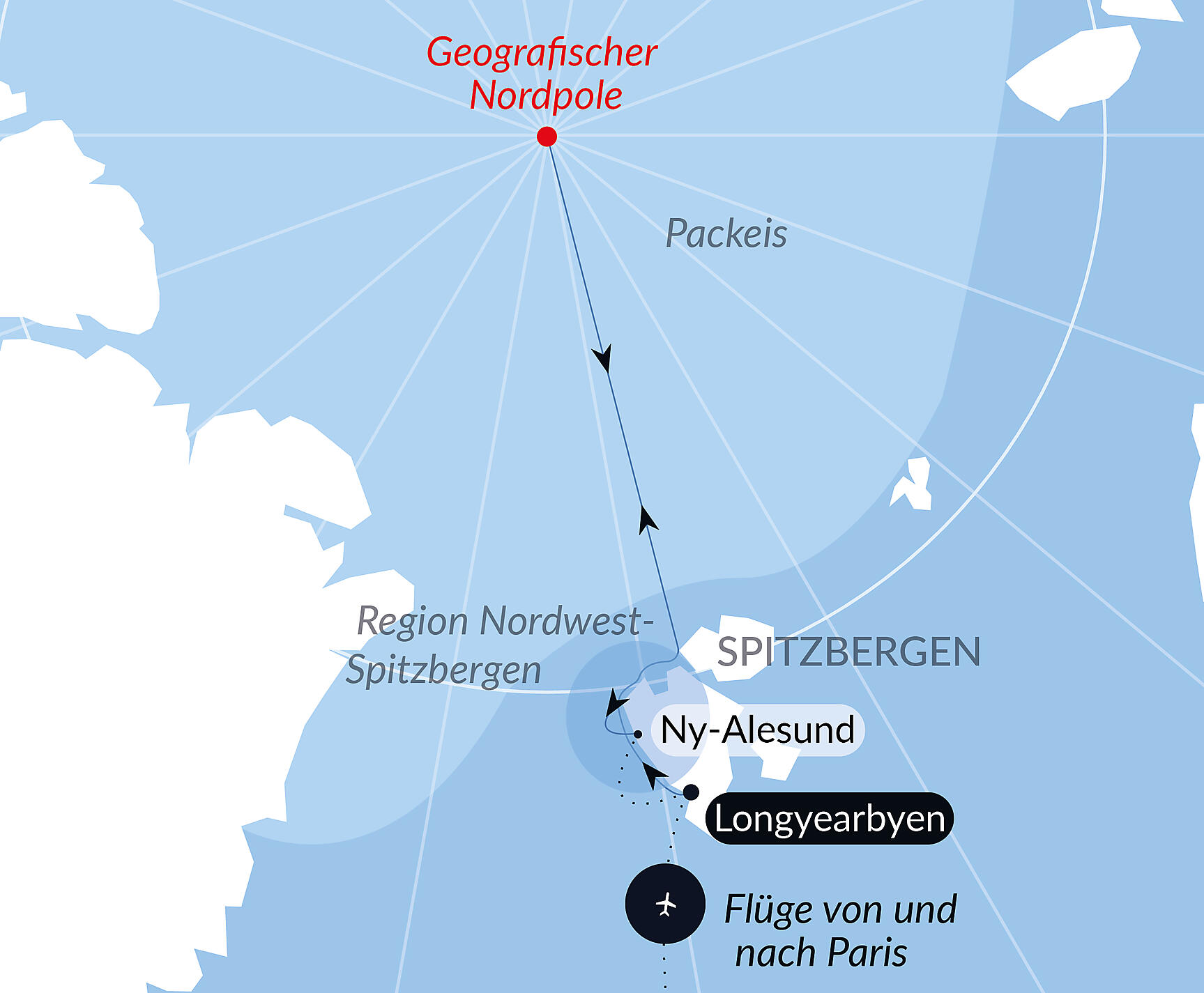 Der geografische Nordpol bei der Breite von 90° befindet sich auf der Rotationsachse der Erde, an der Schnittstelle aller Längenkreise. Sechs Monate des Jahres liegt er im Dunkeln (Polarnacht), dann liegt er sechs Monate lang im Licht der Sonne (Polartag). Dieser mythenhafte ständig von Eis bedeckte und weit von der eisfreien Landoberfläche der Erde entfernte Ort hat bereits Generationen von Polarforschern in seinen Bann gezogen. Nur sehr wenigen Menschen ist es bis heute gelungen, ihn zu erreichen: an Bord der Le Commandant Charcot haben Sie nunmehr die Möglichkeit, Teil dieses exklusiven Kreises zu werden.