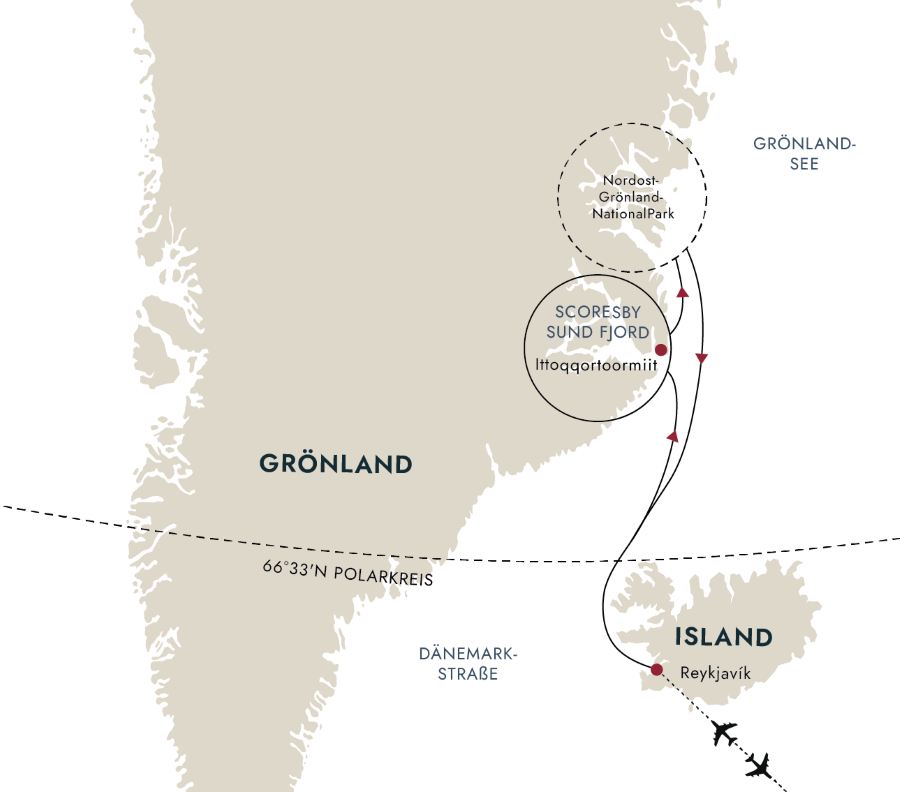 Die örtlichen Wetter- und Eisbedingungen bestimmen unsere genaue Reiseroute. Wir planen jedoch zuerst zum Kangertittivaq zu fahren, dem größten Fjordsystem der Welt. Diese wilde und zerklüftete Region mit ihren unzähligen Eisbergen, die in spiegelglattem Wasser schwimmen, umgeben von hohen Bergen, löst in vielen ein Gefühl von vollkommener Ruhe und Gelassenheit aus. Wenn die Bedingungen es zulassen, werden wir Ittoqqortoormiit, die abgelegenste bewohnte Gemeinde der westlichen Hemisphäre, besuchen.