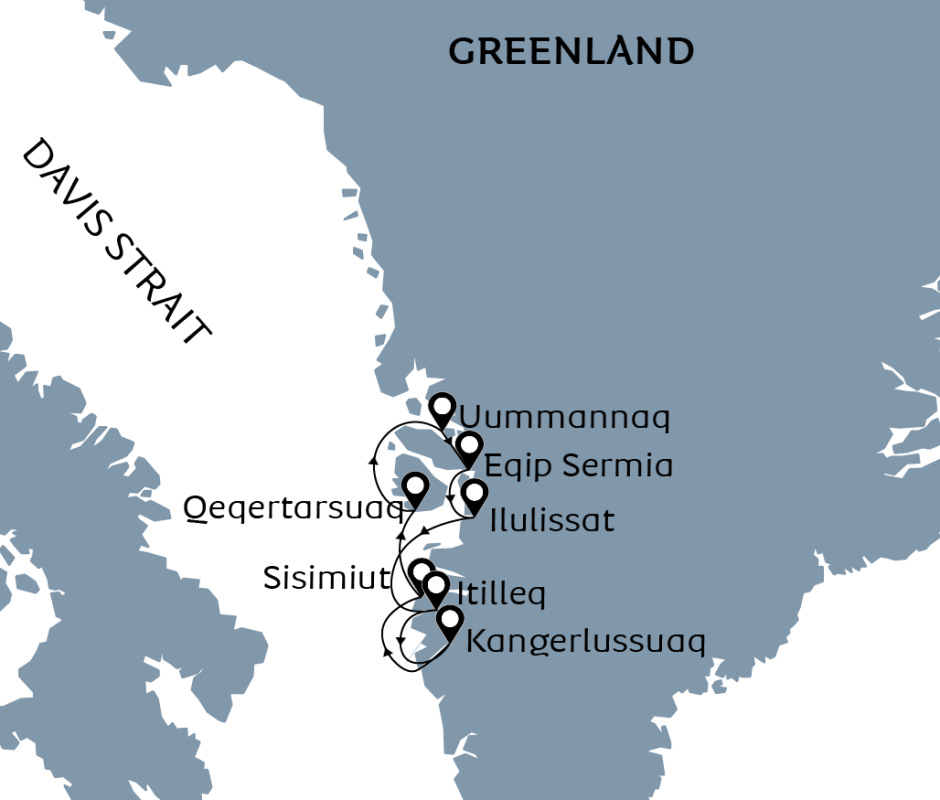Qeqertarsuaq, Disko-Insel Eingebettet unterhalb der 1.000 Meter hohen Berge der Disko-Insel laufen wir in einem wunderschön geschützten Naturhafen ein. Der Ort wurde auf Dänisch treffend Godhavn („Guter Hafen“) genannt, während sein grönländischer Name „Qeqertarsuaq“ einfach „Die große Insel“ bedeutet.In der jüngeren Geschichte Grönlands war Godhavn die meiste Zeit über die politische und wirtschaftliche Hauptstadt Nordgrönlands (während Godthåb, das heutige Nuuk, diese Rolle in Südgrönland innehatte). Seine Bedeutung beruhte auf der enormen wirtschaftlichen Aktivität, die durch den Walfang in der Diskobucht, dem wichtigsten Wirtschaftszweig der Arktis seit dem 16. Jahrhundert, generiert wurde. Als die Walfangindustrie Anfang des 20. Jahrhunderts zusammenbrach, verlor Godhavn seinen politischen Status, da alle Regierungsfunktionen nach Süden nach Godthåb/Nuuk verlegt wurden, und die Stadt war gezwungen, sich neu zu erfinden, indem sie 1979 ihren Namen in Qeqertarsuaq änderte. Heute sind Jagd und Fischfang die wichtigsten Wirtschaftszweige in Qeqertarsuaq, während der Tourismus immer wichtiger wird. Im Sommer legen täglich Fähren aus der gesamten Disko-Bucht in der Stadt an, während der Zugang im Winter nur per Hubschrauber vom nahe gelegenen Ilulissat aus möglich ist.Die weitläufigen rot-schwarzen Basaltberge von Qeqertarsuaq unterscheiden sich grundlegend von den sanften Granithügeln, die für einen Großteil Grönlands charakteristisch sind, und bieten einen viel reicheren Boden. Obwohl die Insel weit über dem Polarkreis liegt, ist sie aufgrund des fruchtbaren vulkanischen Bodens und des milden Mikroklimas im Vergleich zum Rest des Landes viel grüner und üppiger. Im Sommer kommen Einheimische aus der gesamten Diskobucht auf die Insel, um zu jagen und Engelwurz, Kräuter und Pilze zu sammeln. Die atemberaubenden Felsformationen und schwarzen Sandstrände ziehen Besucher aus aller Welt an. Die Stadt selbst ist typisch grönländisch, mit malerischen bunten Häusern, einem großartigen Museum und der einzigartigen achteckigen Kirche, die den Spitznamen „God's Inkpot“ (Gottes Tintenfass) trägt (erbaut im norwegischen Stabkirchenstil). Mit hervorragenden Wandermöglichkeiten, freundlichen Einheimischen und einem faszinierenden Platz in der regionalen Geschichte hat Qeqertarsuaq viel zu bieten.Am Nachmittag unseres Tages auf der Disko-Insel werden wir unser Schiff etwas weiter östlich positionieren und unsere Flotte von Zodiacs zu Wasser lassen, um die Küste von Kuannit zu erkunden. Kuannit bedeutet auf Grönländisch „Angelica“ und bezieht sich auf das Kraut, das an den üppigen Südhängen der Insel reichlich wächst. Dieser Küstenabschnitt ist eines der bestgehüteten Geheimnisse Grönlands. Mit üppigem Grün, das von Wasser aus Bergquellen trieft, spektakulären, bizarren Basaltfelsformationen, die von Höhlen und Wasserfällen durchzogen sind, und zahlreichen saphirblauen Eisbergen ist dieser Küstenabschnitt einer der spektakulärsten in der Arktis.Von Kuannit aus nehmen wir Kurs nach Norden in Richtung Uummannaq.