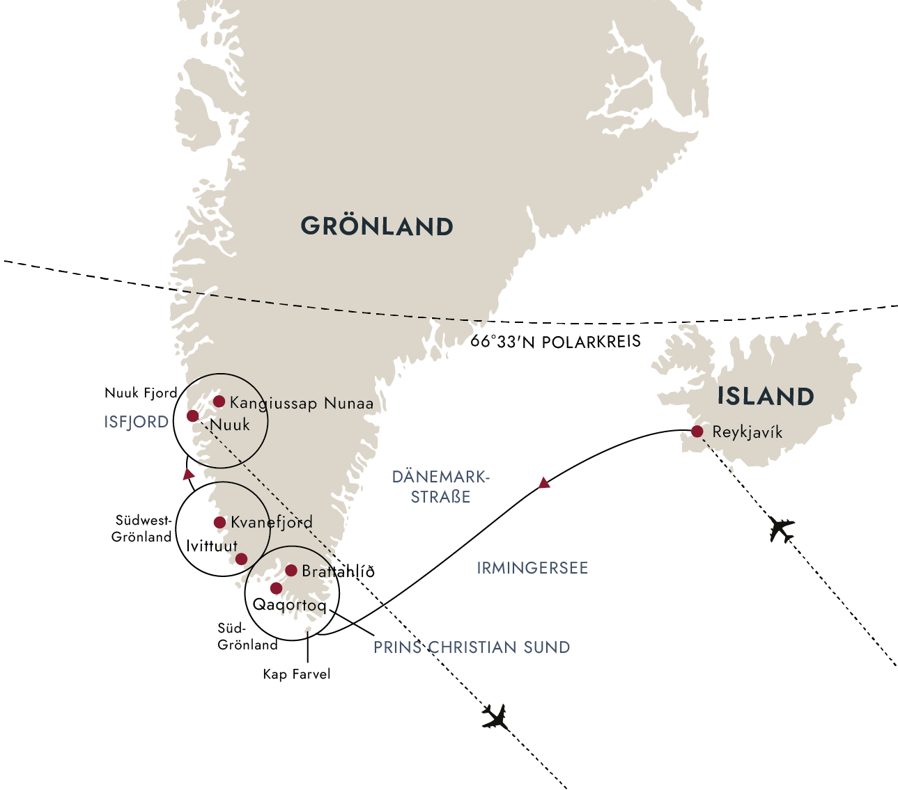 Flüge in der Economy-Class von Deutschland nach Reykjavík und von Nuuk zurück nach Deutschland (über Kopenhagen) inklusive aller Steuern sowie Rail&Fly-Ticket hin und zurück