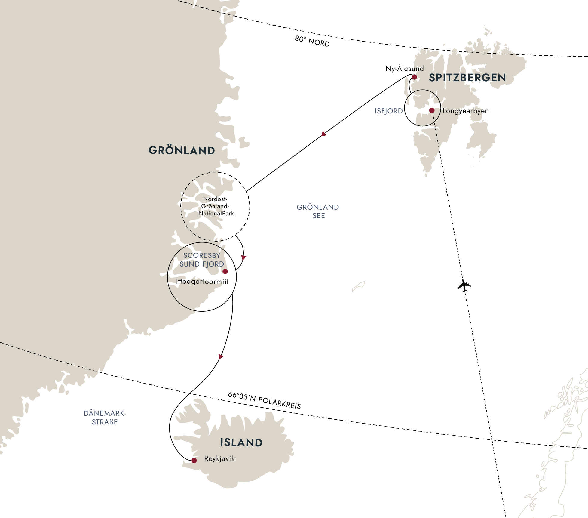 Die örtlichen Wetter- und Eisbedingungen bestimmen unsere genaue Reiseroute. Wir planen jedoch zuerst zum Kangertittivaq zu fahren – dem größten Fjordsystem der Welt. Diese wilde und zerklüftete Region mit ihren unzähligen Eisbergen, die in spiegelglattem Wasser treiben, umgeben von hohen Bergen, löst in vielen ein Gefühl vollkommener Ruhe und Gelassenheit aus. Wenn die Bedingungen es zulassen, werden wir Ittoqqortoormiit, die abgelegenste bewohnte Siedlung der westlichen Hemisphäre, besuchen.