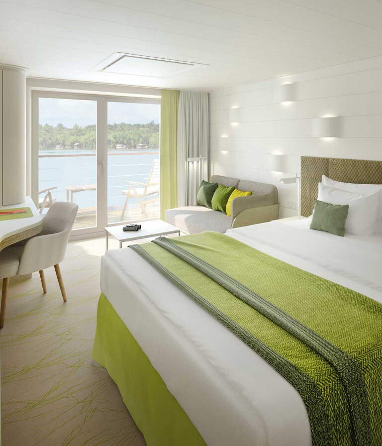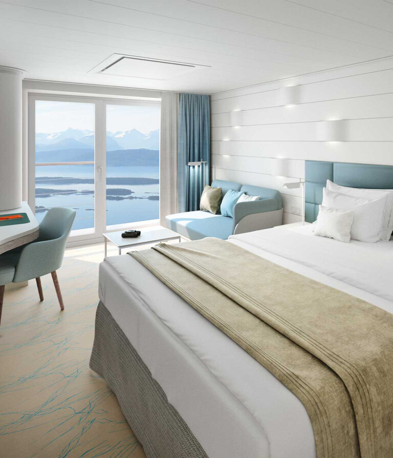 In jeder Kabine: Champagner zur Begrüßung, mit alkoholfreien Getränken täglich neu gefüllte Minibar (Junior und Grand Suiten mit zusätzlicher Auswahl), Kaffeemaschine (auf Wunsch Tee), 24-Stunden-Kabinenservice
