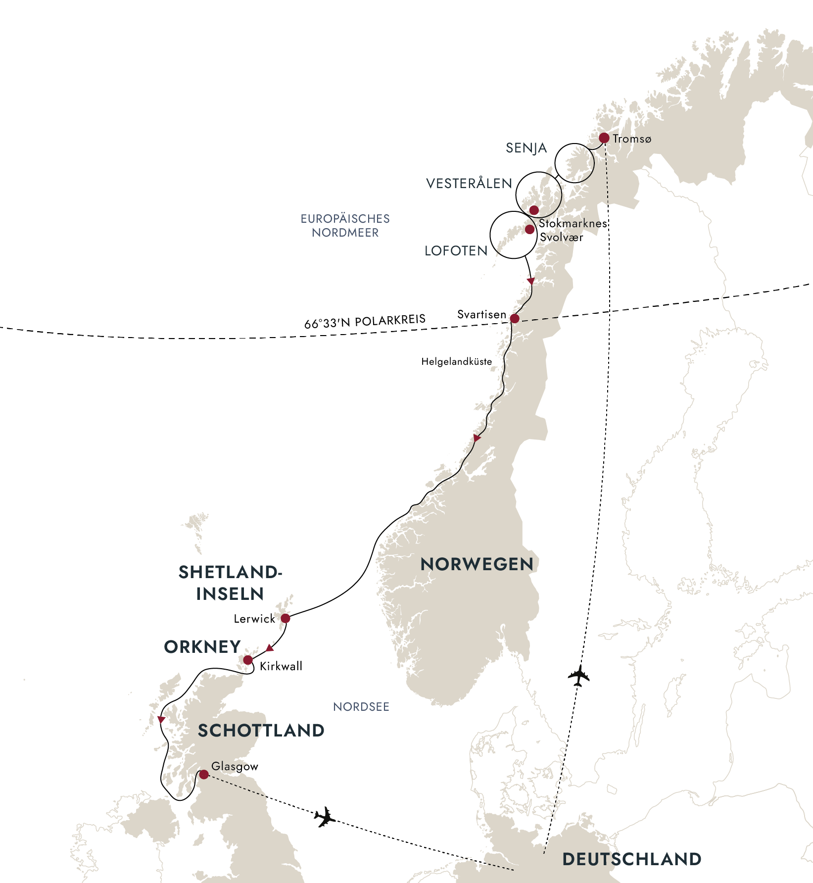 Flug in der Economy Class von Deutschland nach Tromsø und von Glasgow nach Deutschland inklusive aller Steuern, Rail & Fly hin und zurück