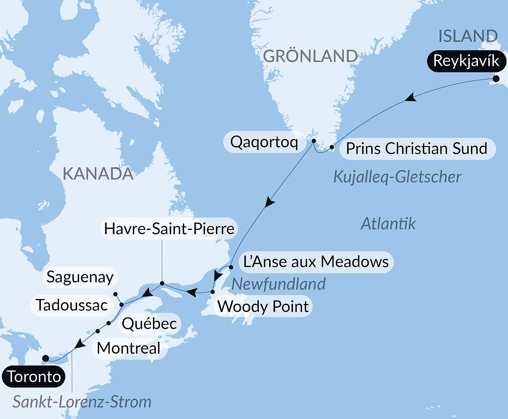 Vor der kanadischen Küste entdecken Sie die Insel Saint-Pierre, eine der beiden Hauptinseln des Archipels Saint-Pierre und Miquelon, des einzigen französischen Staatsgebietes in Nordamerika. Die Insel mit dem Namen des Schutzpatrons der Fischer besitzt einen geschützten Naturhafen und lebt hauptsächlich von der Fischereiindustrie. Noch heute bewahrt sie viele Spuren ihrer Vergangenheit. Sei es der Walfang, die Kabeljaufischerei oder der Alkoholschmuggel während der Prohibition… All diese Erinnerungen sind in der Hauptstadt Saint-Pierre noch heute lebendig. Die Insel ist auch für die Beobachtung ihrer außergewöhnlichen Fauna berühmt: Wale, Finnwale, Delfine, Robben, Papageitaucher und Sturmvögel sind hier zu sehen.