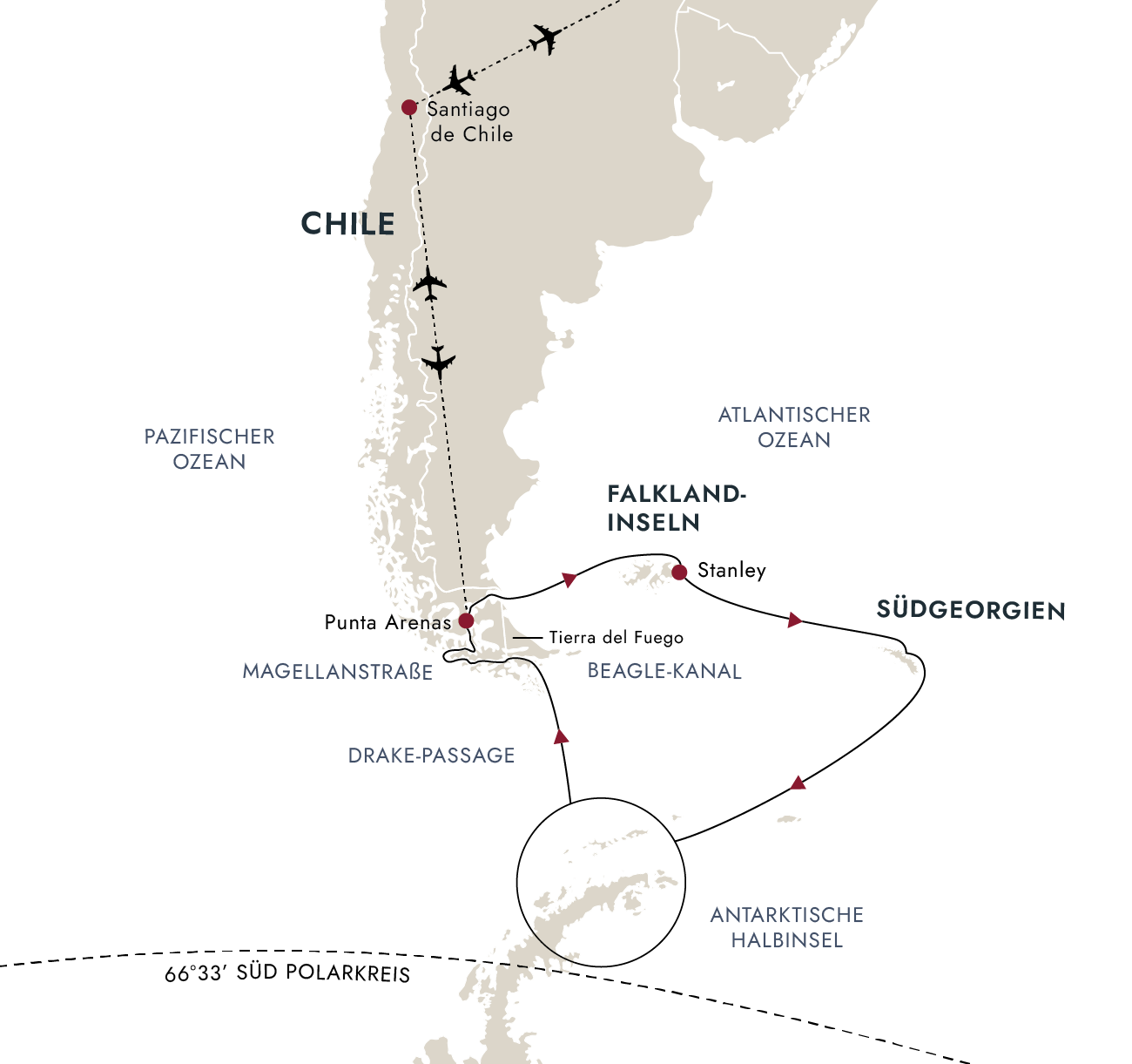 Ihre Expeditionskreuzfahrt zu den Falklandinseln, Südgeorgien und der Antarktis endet in Punta Arenas. Von hier aus fliegen Sie zurück nach Santiago de Chile, wo Sie eine weitere Übernachtung genießen werden.