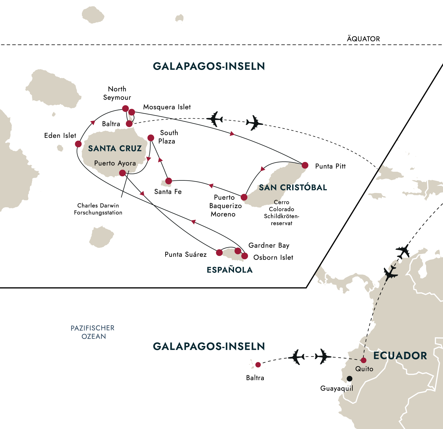 Ihr Flug von Baltra geht nach Guayaquil. Wenn Sie Ihre Expedition in Quito beenden möchten, informieren Sie bitte Ihren Buchungsagenten.