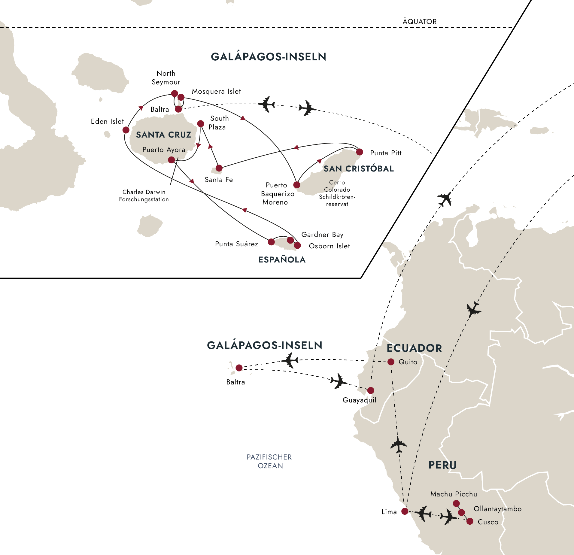 Ihre Expeditions-Seereise neigt sich dem Ende zu, wenn Sie auf der Insel Baltra von Bord gehen. Ein Bus bringt Sie zum Flughafen Baltra, von wo aus Sie über Guayaquil zurück nach Deutschland fliegen – es sei denn, Sie reisen für ein weiteres Abenteuer erst noch nach Quito.