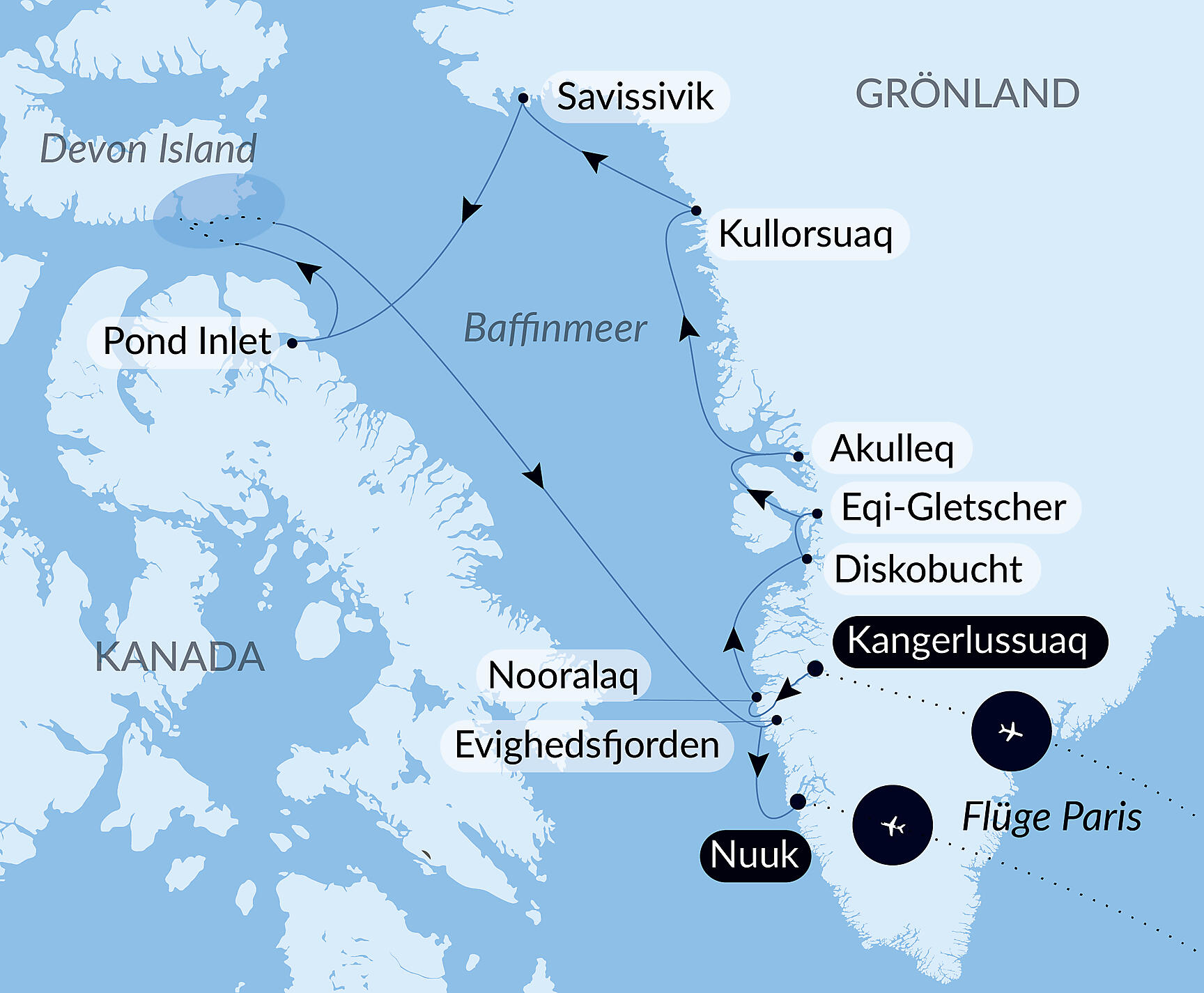 Devon-Island liegt in der Baffin Bay und ist Teil des kanadisch-arktischen Archipels. Robert Bylot und William Baffin waren die ersten Europäer, die die Insel im Jahr 1616 entdeckten. Devon Island wurde jedoch erst zwei Jahrhunderte später von dem Briten William E. Parr kartografiert und nach der gleichnamigen Region benannt. Um 1920 errichtete die Hudson's Bay Company hier einen Pelzhandelsposten, bis die Inuit 1936 die Insel verließen. Ein weiterer Siedlungsversuch fand in den frühen 1950er-Jahren statt. Heute sind nur noch einige verfallene Gebäude als Überreste aus dieser Zeit erhalten. Inmitten der majestätischen Landschaft des hohen Nordens begegnet man einer reichen arktischen Tierwelt, darunter dem Herrscher dieser Gefilde, dem Eisbären, den Sie mit etwas Glück in seinem natürlichen Lebensraum beobachten können.