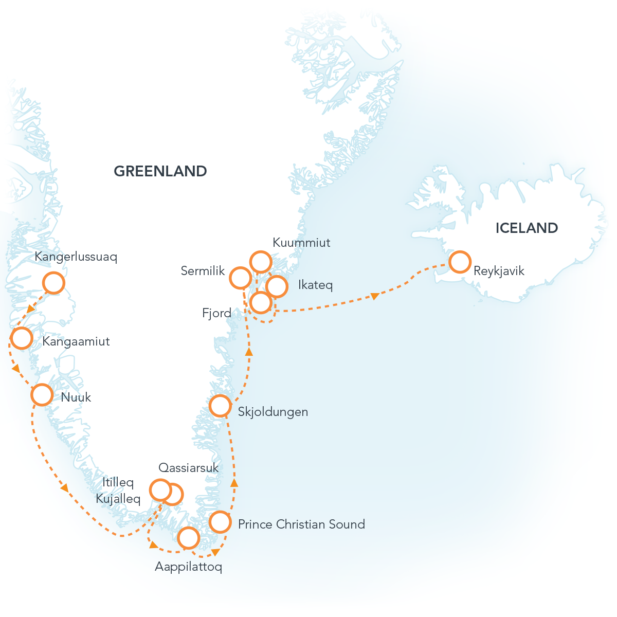 Appilaattoq und Prins Christian Sund Am Morgen erreichen wir Aappilattoq, ein kleines, abgelegenes Dorf unter Granitfelsen, bekannt für seinen traditionellen Lebensstil, malerische Wanderwege und den berühmten lokalen Chor. Am Nachmittag setzen wir unsere Reise nach Osten fort und fahren durch den spektakulären Prins Christian Sund, eine 60 km lange, mit Eisbergen gefüllte Meerenge, die Ost- und Westgrönland verbindet. Umgeben von Bergen, Gletschern und Tälern ist sie eine der spektakulärsten Wasserstraßen der Welt.