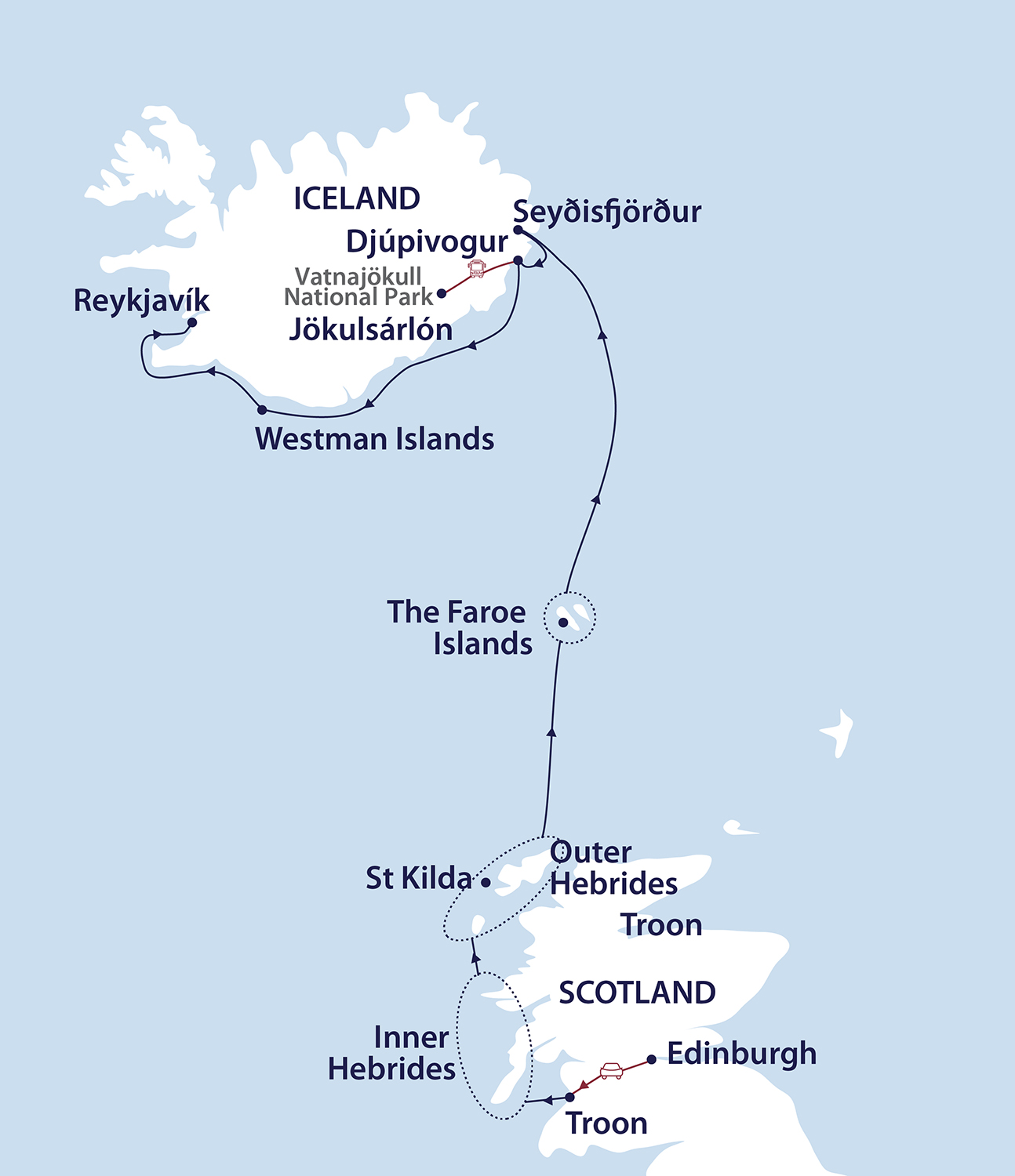 In Iceland’s east, we disembark in Djúpivogur, our gateway to Vatnajökull National Park, home to Europe’s largest glacier. Personalise your expedition with our included ‘Your Choice’ experiences that best suits your interests and level of fitness. Option 1 - Waterfalls, Glacial Lagoons & Hot Tubs (Duration: 10 hours including driving to/from Djúpivogur / Level of difficulty: Easy / Maximum numbers: 30 x 2 groups). Your first stop is at Fossárfoss, a waterfall surrounded by majestic mountains with spectacular views. The layered basalt flow formations that surround the area offer a striking contrasting vista making this a favourite location among photographers. From here we depart for Vatnajökull National Park, one of the most famous natural attractions in the world. Explore the astonishing and exotic natural beauty of Jökulsárlón Glacier Lagoon by four-wheeled Amphibian boat. Here we observe giant icebergs float slowly towards the ocean from the glacier. Following lunch, re-join the coach and head for Diamond beach, a black sand beach where the icebergs are washed ashore, and Fjallsárlón lagoon, renowned for the shimmering icebergs that float in its waters. Concluding our day, we continue to the geothermal hot tubs in Hoffell, perfect for a nice, relaxing soak with an otherworldly view. Option 2 - Wonders of Vatnajökull National Park & Canyon Hike (Duration: 9 hours including driving to/from Djúpivogur / Level of difficulty: Moderate / Maximum numbers: 40). Your first stop is at Fossárfoss, a waterfall surrounded by majestic mountains with spectacular views. The layered basalt flow formations that surround the area offer a striking contrasting vista making this a favourite location among photographers. From here we depart for the dramatic Múlagljúfur Canyon, a true hidden gem ideal for hiking. Here we navigate through overgrown bushes, small river streams, and different trails along the rim of the canyon. Find yourself marvelling at the panoramic views of Fjallsárlón glacier lagoon, picturesque mountains, vibrant textures, and intriguing rock formations. Following lunch, re-join the coach and head for Vatnajökull National Park, one of the most famous natural attractions in the world. Explore the astonishing and exotic natural beauty of Jökulsárlón Glacier Lagoon by foot. Here we observe giant icebergs float slowly towards the ocean from the glacier. Re-join the coach for Diamond beach, a black sand beach where the icebergs are washed ashore. *Note: Múlagljúfur Canyon Hike is 3.8km (2.35 miles) one way and approximately 3 hours duration. Terrain – 315 metre elevation with a narrow unpaved trail with two small river crossings, very easy to cross. Option 3 - Falljökull Glacier Hike (Duration: 9 hours (4 hours on the glacier) / Level of difficulty: Moderate-Difficult / Maximum numbers: 45). Your first and only stop today is at Falljökull, one of the most impressive outlet glaciers of the Vatnajökull ice cap and a once in a lifetime experience. We will take an inspiring walk along a winding path through the glacier's dramatically changing landscape. Arriving at the tongue of the glacier, we will have your crampons ready and waiting for you. With your knowledgeable guide leading the way, you will soon be exploring impressive terrain, walking through a wonderland of ice formations and brilliant blue colours. Following a hard-earned late lunch, re-join the coach and depart for the ship in Djúpivogur. *Note: Falljökull Glacier Hike equipment provided - ice axe, crampons, harness and helmet. The minimum shoe size to attach crampons is EU 35 (boots can be hired at additional cost if necessary). Requires a higher level of fitness and agility as you will be on your feet for a long period of time (4 hours) and the terrain is challenging. Please note the transfer to and from the ship and Falljökull Glacier is 3 hours each way, so come prepared with a book or enjoy the magnificent scenery and a nice nap enroute.