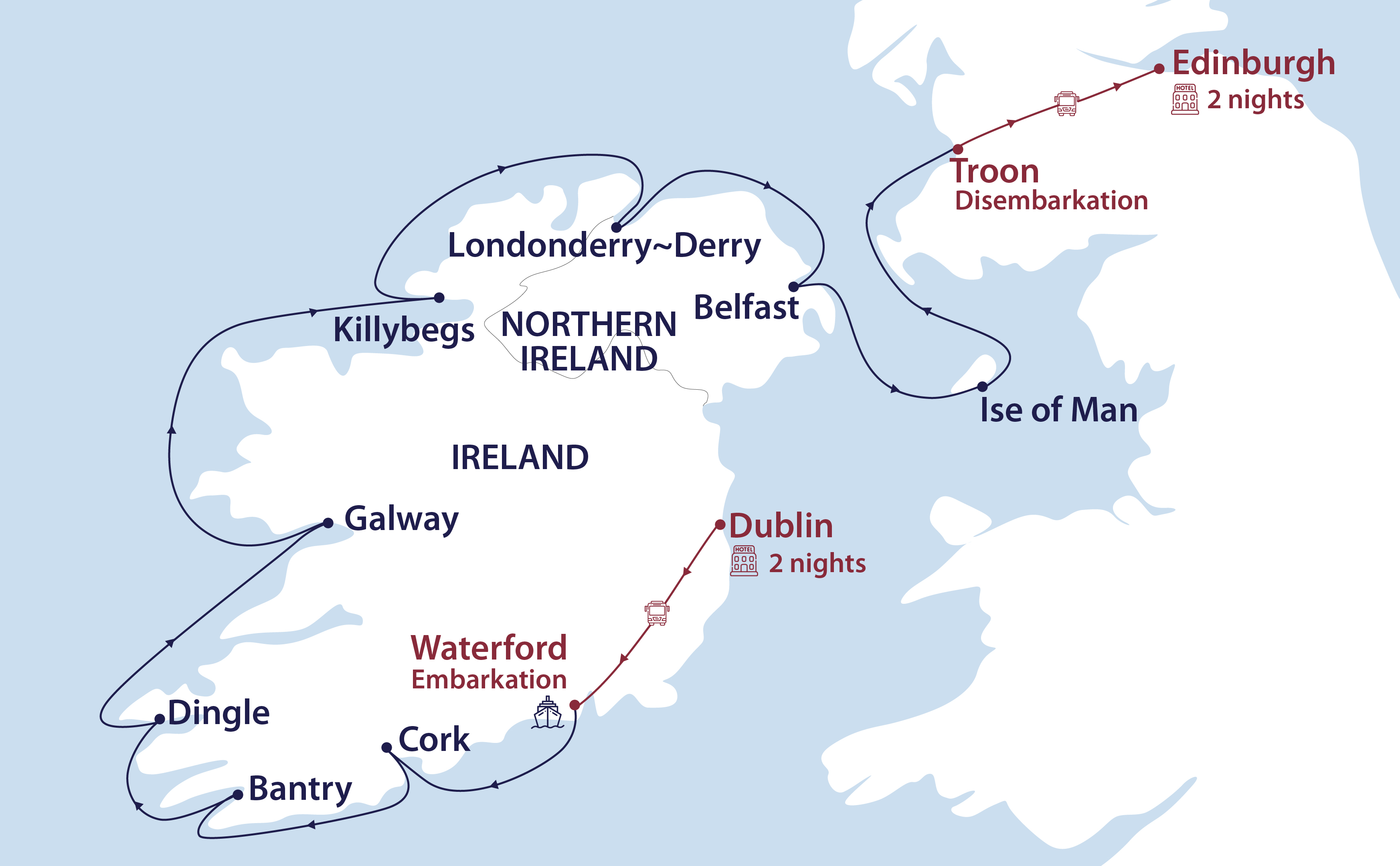 It is fair to say Belfast has endured its share of turbulent times. Famines, disease, invasions and recessions have painted a picture of a resilient city, but it was the more recent period known as ‘The Troubles’ that defined its image of division. Barbed wire, armed soldiers, and constant bomb searches kept tourists away. Today, however, Belfast has transformed, thanks to open political dialogue and foreign investment. The city feels lighter, as if a heavy burden has been lifted from its shoulders. Spend your morning at the iconic Dockyard of Belfast to experience the story of the city’s most famous production: HMS Titanic at the Titanic Experience or enjoy an introductory driving tour of Belfast’s famous ‘quarters. Our small ship status affords us a berth ‘in town’ with time to explore Belfast independently this afternoon using our complimentary ship to shore shuttle, before we sail to one of the United Kingdom’s most unique islands – The Isle of Man. Personalise your exploration with our included ‘Your Choice’ experiences. Option 1 – Morning experience: Welcome to Belfast. Welcome to Belfast, a city shaped by stories, creativity, and resilience. This morning, enjoy a scenic drive through its lively streets where you’ll notice the city isn’t divided by north, south, east, or west, but by cultural “quarters,” each with its own unique character. In the Cathedral Quarter, cobbled lanes echo with live music and colourful murals, while the Titanic Quarter stretches along the waterfront, where shipbuilding once ruled the skyline. Over in the Queen’s Quarter, elegant gardens and striking university buildings reflect Belfast’s academic heart, and the Gaeltacht Quarter adds a vibrant dose of Irish language and tradition. Belfast is full of surprises, from its Victorian architecture and quirky pubs to the humour and warmth of its people. After this relaxed introduction, you’ll enjoy free time to explore the city at your own pace, whether shopping, sightseeing, or simply soaking up the atmosphere, before returning to the ship in time for lunch. Option 2 – Morning experience: The Queen of all ships – The Titanic Experience. This interesting tour is filled with stories of the workers who toiled 14-hour days to build the world’s most glamorous ships. Did their haste affect the fate of the Titanic? The dockyard’s Titanic Experience, located where the ship was built, may provide some answers. Guided by a local, you will hear why and how the ship was constructed and what happened in its final hours, walking in the footsteps of the designers and shipbuilders. Discover the world-famous story through their eyes. In the self-guided Titanic Experience, uncover the sights, sounds, and stories of the ship, the city, and the people who built her. Learn about the sinking, the aftermath, the quest to find Titanic, and her final resting place, through unique artefacts and replicas of staterooms and social areas. After our tour, we return to the ship for lunch, with our afternoon free for further independent exploration of Northern Ireland’s capital city.
