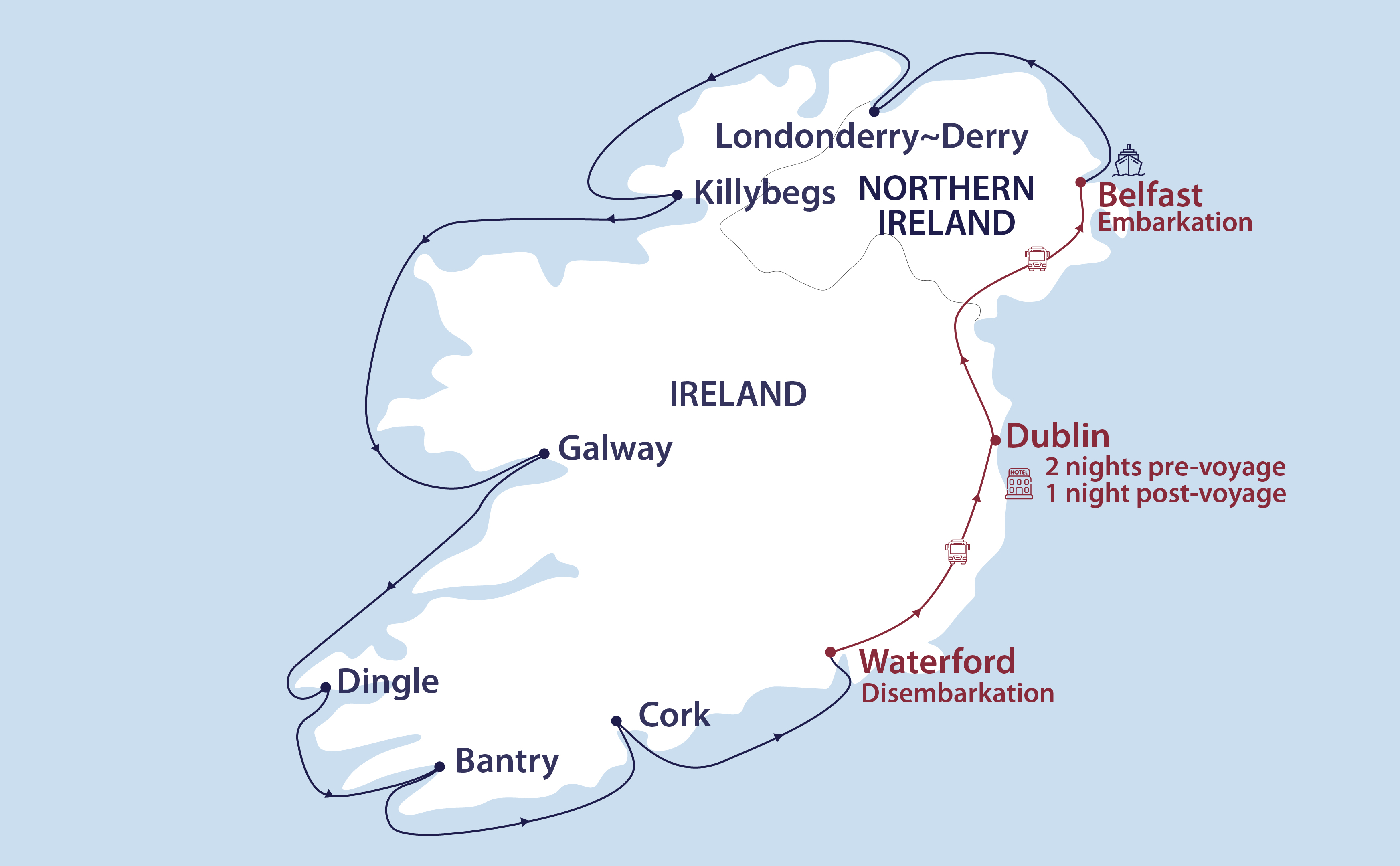 One night’s hotel accommodation, including breakfast, in Dublin on Day 10