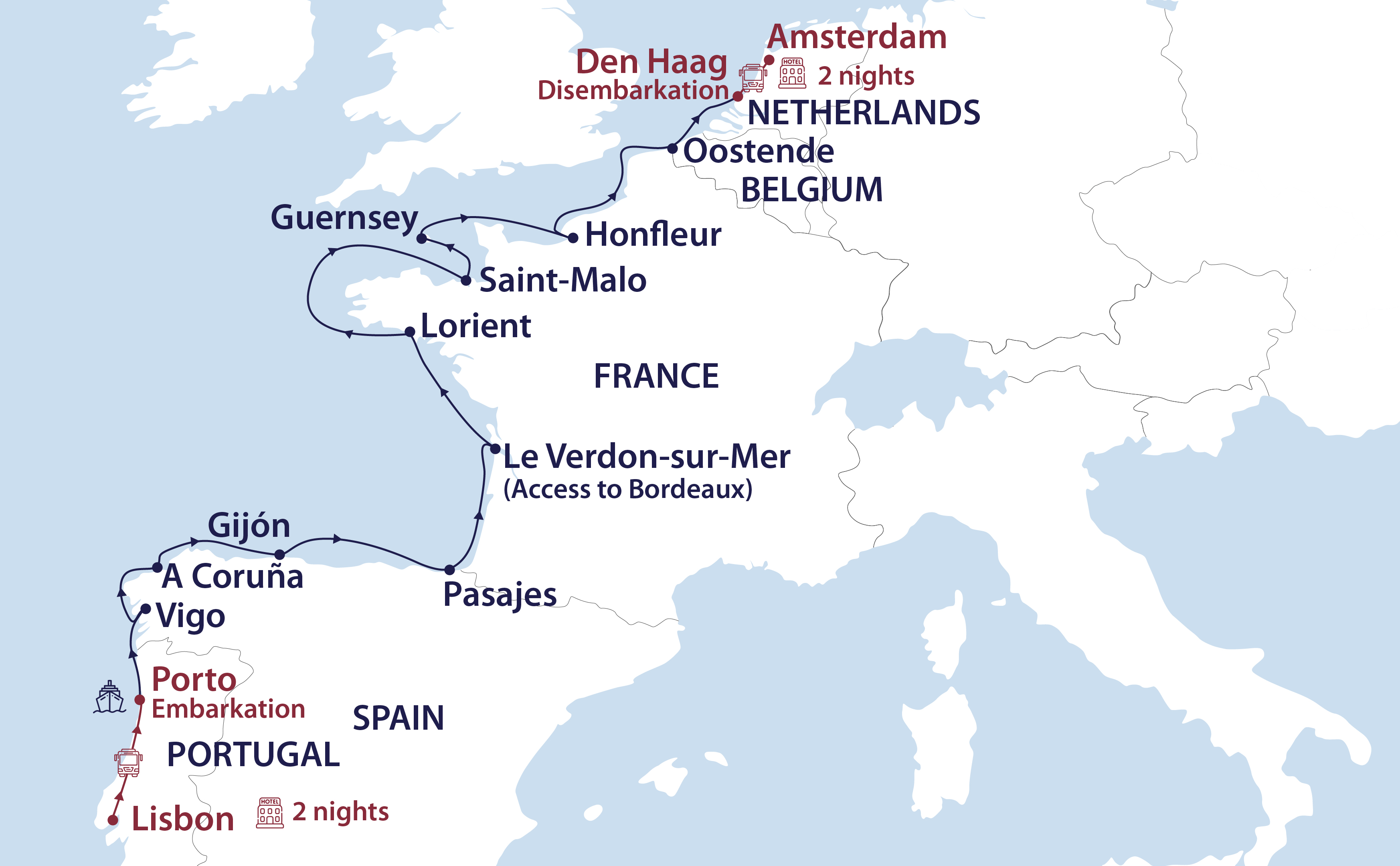 Today, we dock at the port of Le Verdon, the northern gateway to the Médoc region. Due to tidal restrictions on the Gironde estuary, we moor near its mouth, ensuring dependable access to the region's coastline and the renowned vineyards of Le Médoc. The châteaux in Médoc have been producing wines of exceptional quality for centuries, significantly contributing to Bordeaux’s wealth and reputation. Médoc’s unique terroir, with its gravelly soil and ideal climate, allows for the cultivation of grapes that produce wines known for their elegance, complexity, and ageing potential. While some wineries require visitors to be licensed wine merchants, many warmly open their cellar doors for tastings to wine enthusiasts from around the world. Our ‘Your Choice’ experiences offer you the opportunity to immerse yourself in Médoc’s winemaking tradition or learn the dramatic story of the Atlantik Wall WW II fortifications which once scattered this shoreline. For those who would prefer an independent trip to the French seaside, a shuttle will operate from the port to the coastal hamlet of Le Verdon-sur-Mer throughout the day. Personalise your exploration with our included ‘Your Choice’ experiences.Option 1 – Morning experience: The Wines of Médoc – A Winery Tour and Tasting. Discover the heart of the Médoc on a relaxed coach tour through one of France’s most storied wine-growing regions. As you travel along the famed Route des Châteaux, you’ll pass through a landscape draped in vines, where stone châteaux rise among the rows and village church steeples peek above patchworked paddocks. This region is celebrated for its powerful, age-worthy red wines, crafted primarily from cabernet sauvignon and merlot, with touches of petit verdot and malbec. The gravel-rich soils and temperate climate lend structure and elegance to the wines, known for their deep colour, firm tannins, and layered aromas of dark fruit, spice, and cedar. A highlight of the morning is a visit to a traditional château winery. Here, you’ll step into the rhythm of life on the estate, exploring the cellars, learning about their heritage winemaking methods, and enjoying a tasting that reflects the soul of the land. It’s an authentic glimpse into the Médoc’s enduring legacy, where every glass tells a story.Option 2 – Morning experience: The bunkers of the Atlantik Wall. Just beyond the dunes of Soulac-sur-Mer, in the commune of Le Verdon-sur-Mer, lies Batterie de Arros, once known as Stutzpunkt 307 Reichenberg. This sprawling 10-hectare bunker complex was built between 1941 and 1943 by the German Kriegsmarine to defend the mouth of the Gironde River and protect Bordeaux, a vital port for the Nazi war effort. Part of the massive Atlantik Wall, which stretched over 2,600 kilometres (1,615 miles) along Europe’s western coast, the site housed 20 bunkers, including artillery casemates, command posts, and personnel shelters. Touring with a local guide, you’ll explore the remnants of this wartime stronghold, some still bearing original murals and bunk beds. Learn how French forces reclaimed the site in April 1945, and how the Gironde’s strategic importance shaped its heavy fortification. After the tour, enjoy free time in Le Verdon-sur-Mer, where the echoes of history linger in the sea breeze and shifting sands. Choose to return to the ship for lunch or stay on in Le Verdon-sur-Mer and hop aboard our complimentary shuttle to the port when you’re ready.