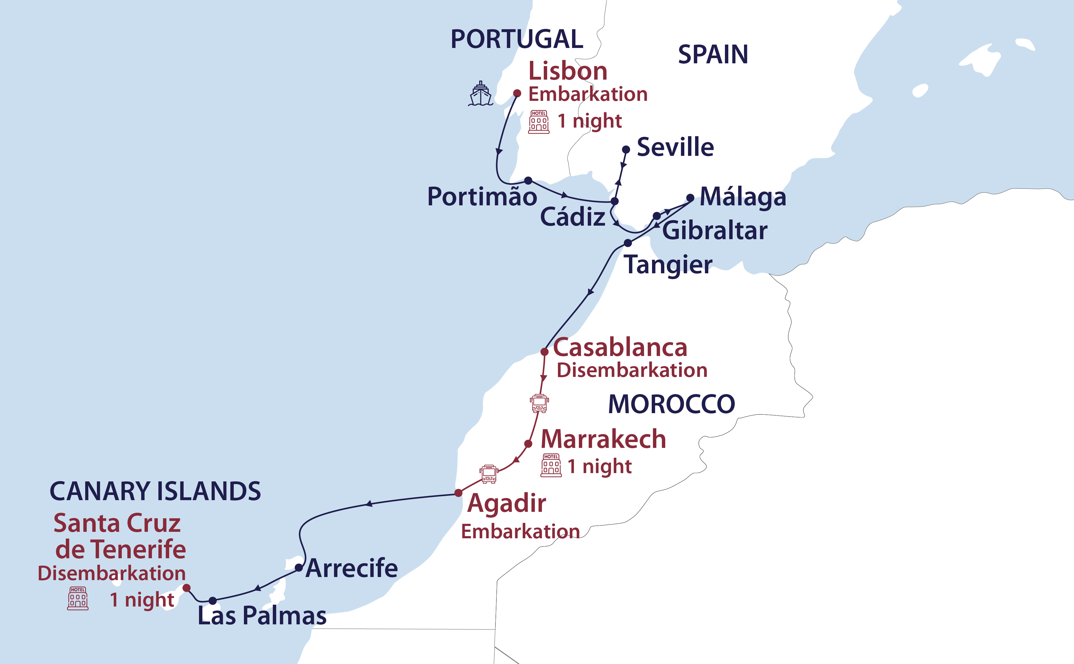 One night’s hotel accommodation, including breakfast, in Santa Cruz de Tenerife on Day 14