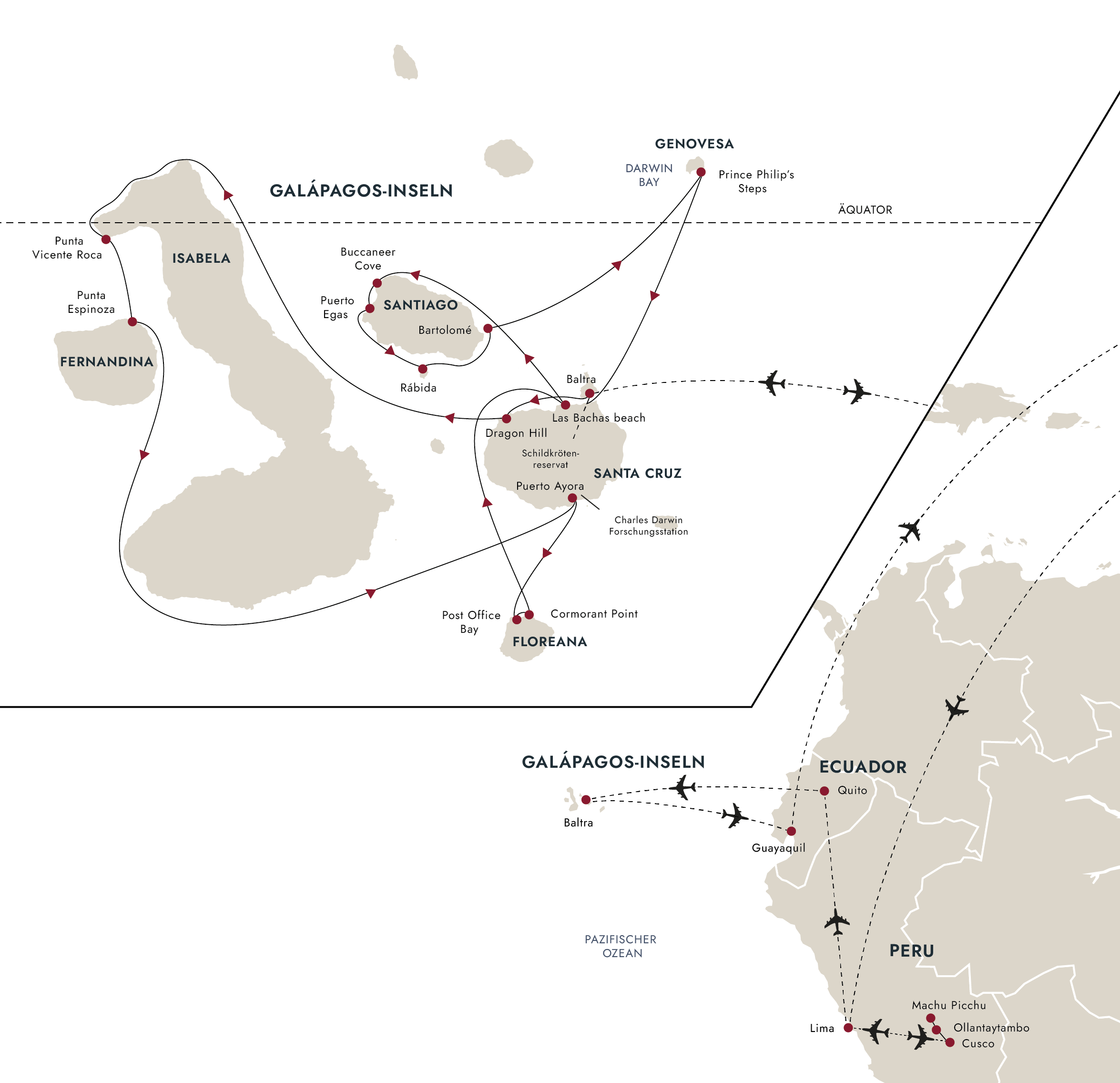 Sobald sich Ihr Landabenteuer in Südamerika dem Ende zuneigt, ist es an der Zeit, die nächste Etappe Ihrer Reise anzutreten. Nach dem Frühstück und einem kurzen Flug erreichen Sie die wunderschöne Insel Baltra, die Teil des spektakulären Galapagos-Archipels ist. Ein Transfer bringt Sie direkt zum Hafen, wo Ihr komfortables Expeditionsschiff MS Santa Cruz II bereits auf Sie wartet.