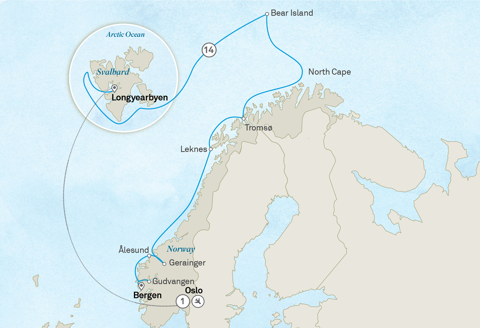Your journey concludes this morning in Longyearbyen, the capital of the Svalbard Archipelago and the northernmost territorial capital on the planet. The glaciers, the mountains stretching as far as the eye can see and the untouched landscapes will make you feel like you’re on the edge of the earth.