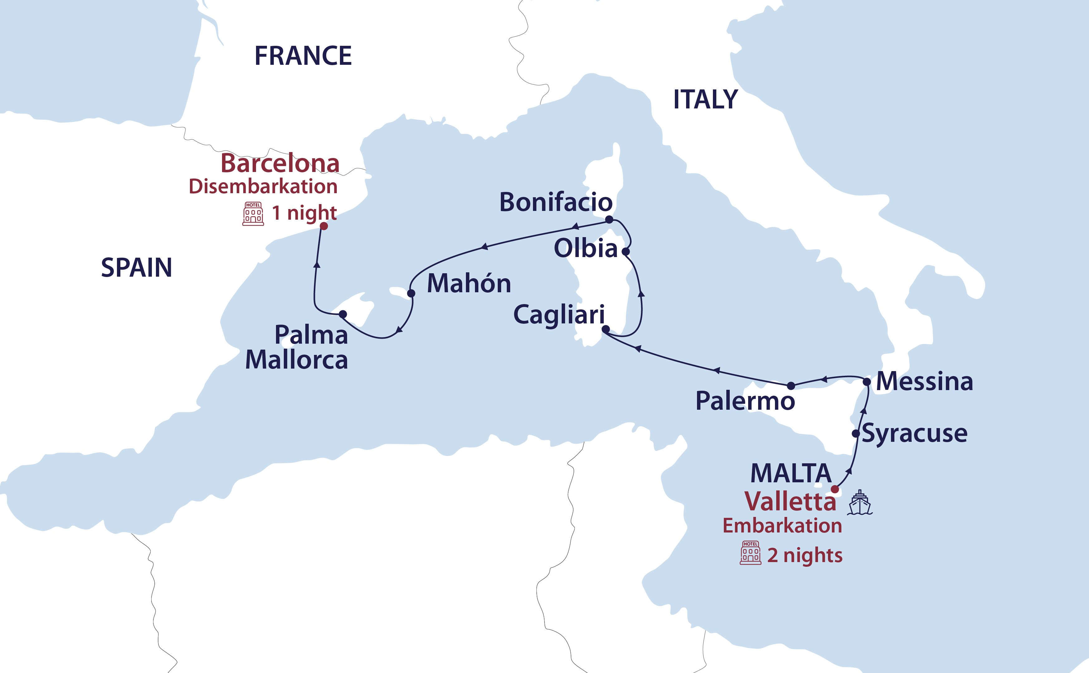 Welcome to Malta. On arrival at Valletta Airport make your way to the Arrivals Hall to meet our representative, followed by a transfer to our group hotel. At the hotel, visit our hospitality desk in the lobby to meet our team who will provide you with useful information regarding pre-embarkation procedures and about your time in Valletta. You will also receive cabin tags for your luggage. Please clearly label the tags with your name and your cabin number on the ship. Today offers time to relax in preparation for our journey. Accommodation: Valletta Hotel.