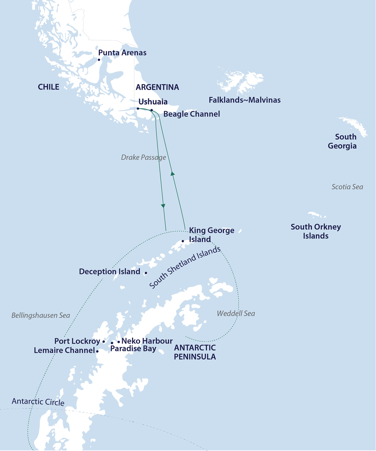 Enjoy a final morning landing in the South Shetland Islands before we re-enter the Drake Passage for our return journey to South America. With lectures and film presentations to complete our Antarctic experience, there is still plenty of time to enjoy the magic of the Southern Ocean and the life that calls it home. There is time for reflection and discussion about what we have seen and experienced. We hope you become ambassadors for Antarctica telling your family, friends and colleagues about your journey to this magical place, advocating for its conservation and preservation so that they might one day visit the region to experience what you have been lucky to see and do here. As we approach the tip of South America, our Captain may sail close to legendary Cape Horn, weather and time permitting.