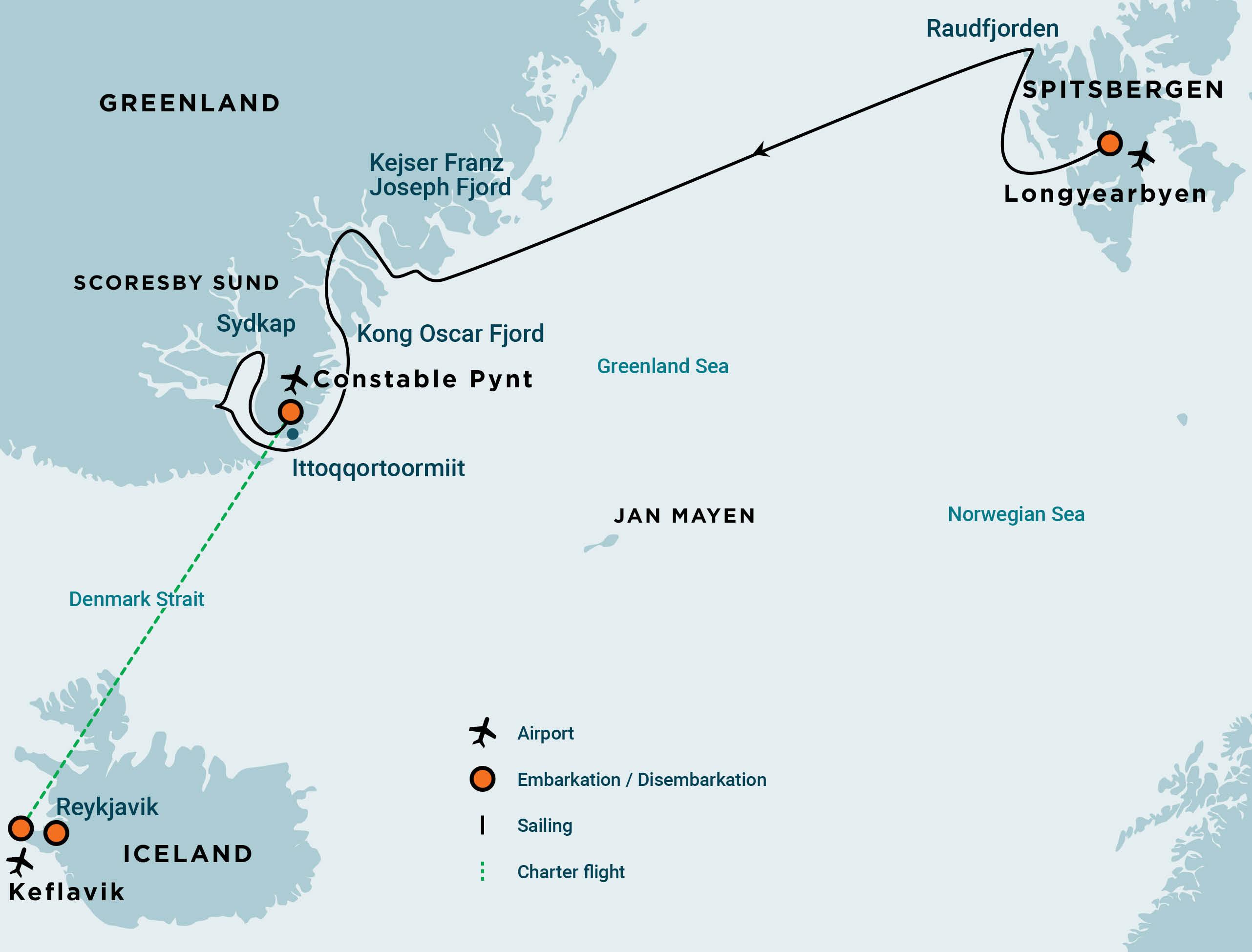 Heute erreichen Sie Scoresby Sund und segeln entlang der vergletscherten Volquart Boons Kyst. Sie können auch eine Zodiac-Fahrt an einer der Gletscherfronten vorbei genießen und die Basaltsäulen und Eisformationen von Vikingebugt besuchen. Am Nachmittag steht ein Besuch der Insel Danmark auf dem Programm, wo Sie die Überreste einer vor etwa 200 Jahren verlassenen Inuit-Siedlung finden. Die kreisförmigen Steinringe weisen auf die Sommerhäuser hin, während die Winterhäuser näher an einer kleinen Landzunge zu sehen sind. Die Stätten sind gut erhalten, mit leicht erkennbaren Eingängen, bärensicheren Fleischvorratskammern und Grabstätten. Am Nachmittag segeln Sie entlang der Ostseite von Milne Land inmitten einer Reihe von verstreuten Eisbergen.
