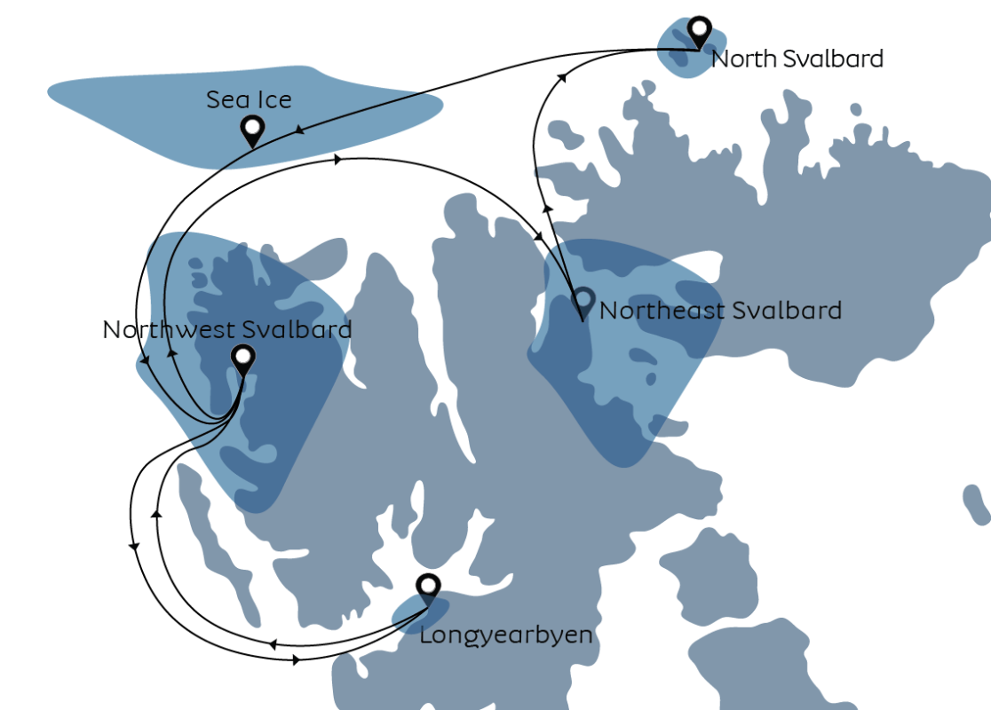 Nordost-Spitzbergen Am Morgen fahren wir in die riesige eisige Wildnis im Nordosten von Spitzbergen. Diese Region wird nicht von den Meeresströmungen erreicht, die West-Spitzbergen warm und feucht halten, und daher ist die Umgebung mit ihren felsigen Polarwüstenlandschaften völlig anders. Riesige Gletscher fließen von den Bergen ins Meer, das selbst im Sommer oft mit Eis bedeckt ist.Auch wenn es karg erscheinen mag, ist es in Wahrheit alles andere als das. Widerstandsfähige Tiere wie Polarfüchse schlagen sich an diesen kalten Ufern durch und halten ständig Ausschau nach Beute. Auf den Klippen über dem Meer drängen sich Hunderttausende von Seevögeln auf Felsvorsprüngen und hüten sorgfältig ihre wertvollen Eier. Die Küstengewässer der Region sind zwar kalt, aber unglaublich produktiv: Es gibt reichlich Schalentiere, die wiederum von Walrossen gejagt werden, die in der Region weit verbreitet sind.Die genauen Orte, die wir besuchen, hängen von den Meeres-, Wind- und Eisbedingungen in der Region ab, die von Jahr zu Jahr variieren und sich selbst im Sommer schnell ändern können. Das ist das Wesentliche an der Polarforschung: sich im Rhythmus von Mutter Natur zu bewegen und die Gelegenheiten zu nutzen, die sie uns bietet!
