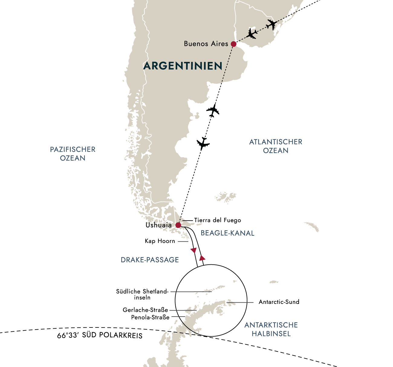 Der Morgen beginnt mit einem frühen Flug nach Ushuaia. Diese Hafenstadt ist die Hauptstadt der argentinischen Provinz Tierra del Fuego (Feuerland) und liegt vor der imposanten zerklüfteten Kulisse der Anden. Ushuaia konkurriert um den Titel der südlichsten Stadt der Welt. Von hier starten viele Abenteuer in die Antarktis – auch unsere.