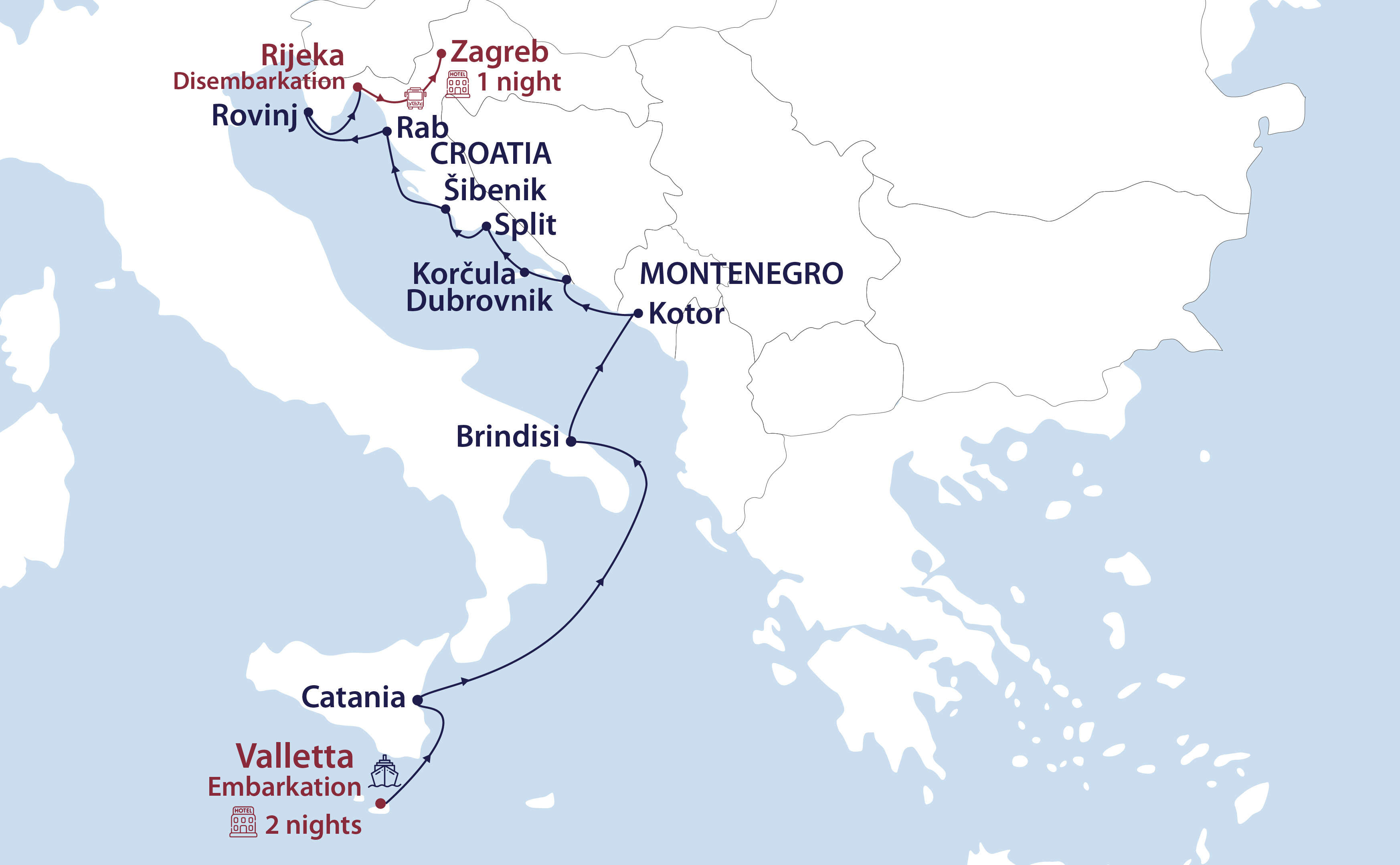 Welcome to Malta. On arrival at Valletta Airport make your way to the Arrivals Hall to meet our representative, followed by a transfer to our group hotel. At the hotel, visit our hospitality desk in the lobby to meet our team who will provide you with useful information regarding pre-embarkation procedures and about your time in Valletta. You will also receive cabin tags for your luggage. Please clearly label the tags with your name and your cabin number on the ship. Today offers time to relax in preparation for our journey. Accommodation: Valletta Hotel.