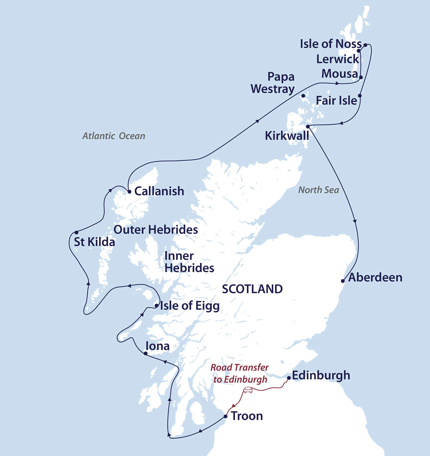 On arrival in Aberdeen, disembark in the early morning and bid a fond farewell to fellow travellers before a transfer to the airport to continue your journey. *Note: At the conclusion of the voyage, we recommend booking flights departing after 12.00 pm on the day of disembarkation in case there are delays.