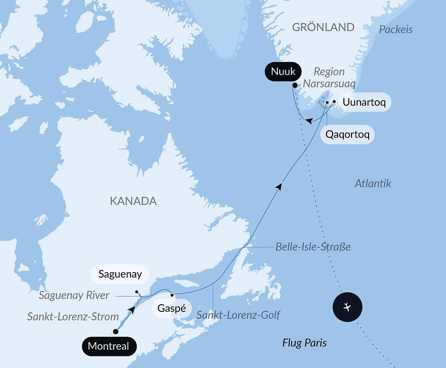 Flight Nuuk/Paris selected by PONANT in economy class.