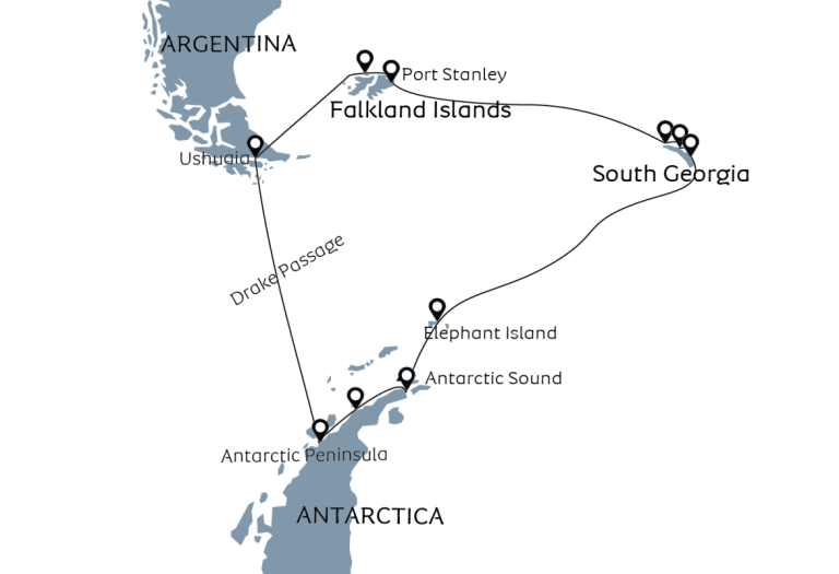 Von Ushuaia in Argentinien aus durchqueren wir die mächtige Drake-Passage auf dem Weg zu den Süd-Shetland-Inseln und der antarktischen Halbinsel. Hier landen wir mit Zodiacs bei Pinguinkolonien, Forschungsstationen und faszinierenden Aussichtspunkten an.