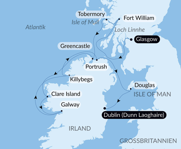 Auf der Isle of Mull erwartet Sie das bunte Hafenstädtchen Tobermory, bevor Sie die rauen Klippen der irischen Halbinsel Inishowen erreichen. Clare Island entführt Sie in eine Welt aus Geschichte und unberührter Natur – einst Heimat der berühmten Piratin Grace O’Malley. Weiter geht es nach Galway und Killybegs, die beide für ihre lebendige Kultur und traumhaften Küsten bekannt sind.