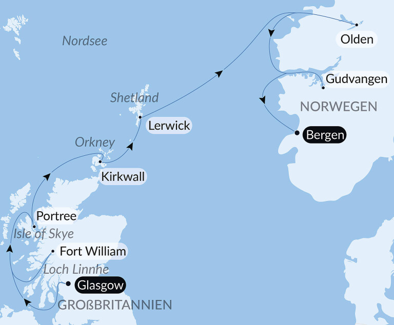 Die Orkney-Inseln mit Kirkwall öffnen Ihnen die Pforten zur neolithischen Vergangenheit – UNESCO-Welterbe live erleben. Auch die Shetland-Inseln mit Lerwick und prähistorischen Jarlshof-Ruinen bieten faszinierende Einblicke in frühe Kulturen. Nach der Überfahrt nach Norwegen erreichen Sie Olden, wo Sie die Gletscherlandschaft des Briksdal-Gletschers erkunden.