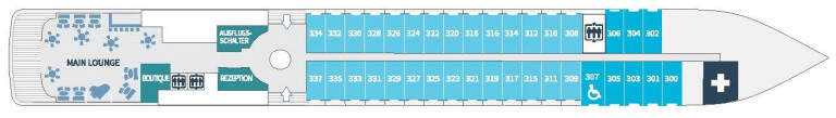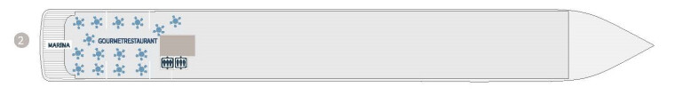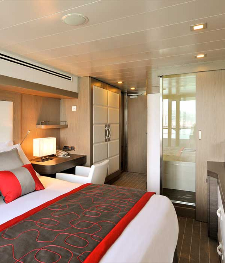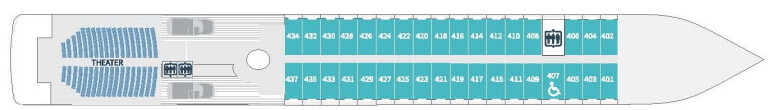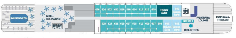 | Kabinen- und Suitentypen | 8 Außenkabine, 115 Balkonkabinen (davon 22 in 11 Suiten umwandelbar), 9 Suiten |