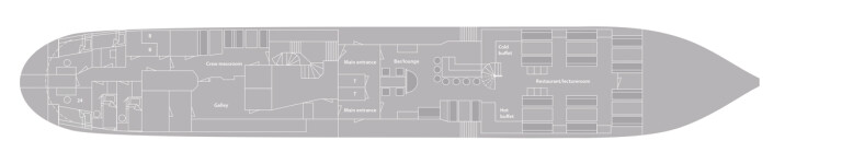 Die Schiffscrew besteht aus 12 erfahrenen Mitgliedern, inklusive 2 Reiseleitern. Das Schiff bietet ausreichend Raum für maximal 33 Passagiere in 16 Doppelkabinen: 1 private Drei-Bett-Kabine (mit Dusche, Toilette & Bullauge); 6 private Doppel-Innenkabinen (mit Dusche & Toilette, ohne Bullauge); 9 private Doppelkabinen (mit Dusche & Toilette, mit Bullauge). Im Speiseraum werden täglich drei einfache, aber gute Mahlzeiten serviert.